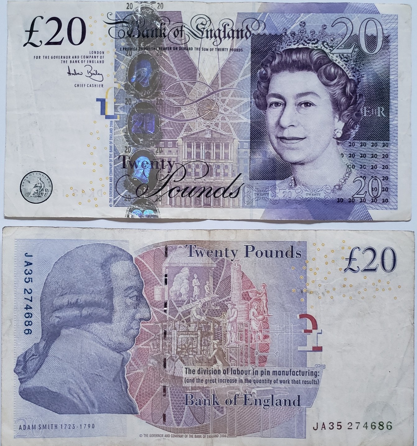 United Kingdom (Great Britain) Twenty Pound Banknote. Various serial numbers. Circulated with creases.