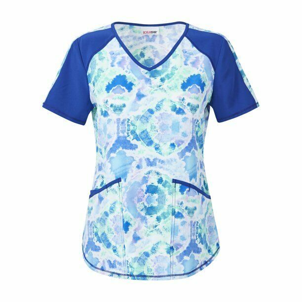 This V-neck top is a contemporary ?take? on the classic tie-dye. Add contrasting sleeves and shirttail hem accents, plus two angled pockets and bonus slim pocket?all on Earth-friendly fabric?for a scrub that?s bound to get compliments.