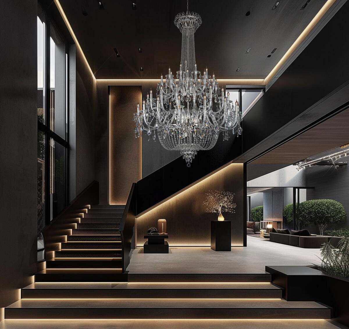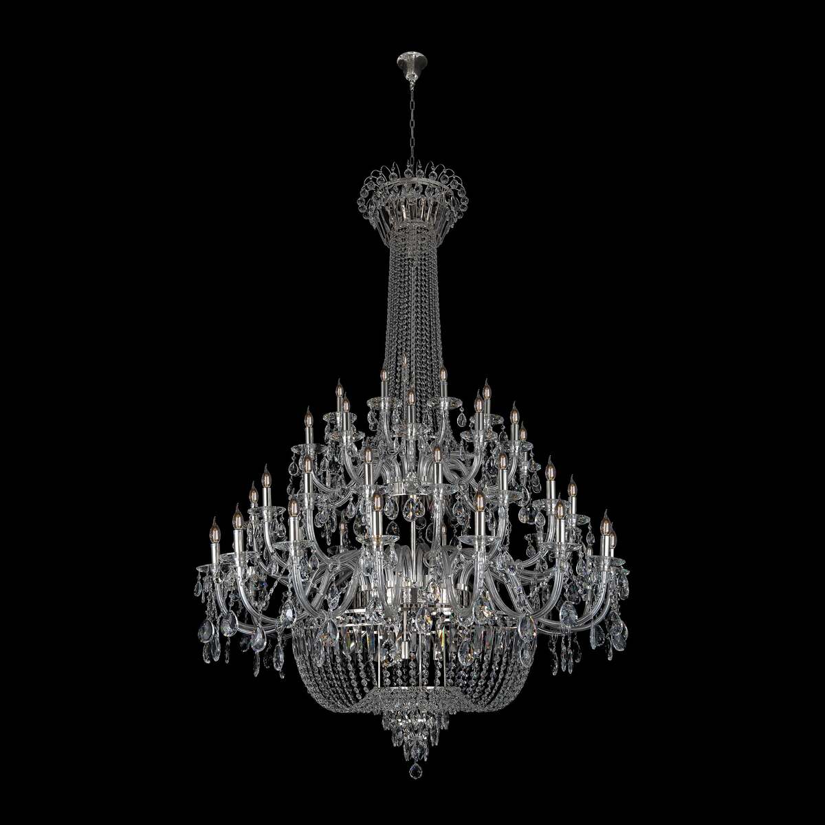 Introducing an unparalleled statement piece, the 56-inch Chrome Empire Crystal Chandelier. This magnificent fixture is designed to grace double-height foyers, grand ballrooms, and luxury hotel lobbies. Inspired by the timeless grandeur of European palaces, this gold empire crystal chandelier evokes architectural elegance and luminous luxury. Each precision cut 30% lead crystal refracts light into a dazzling spectrum, while the rich chrome finish lends warmth and refinement.