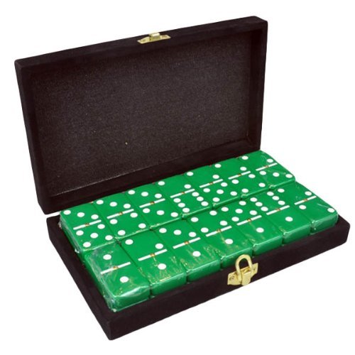 One Double Six Set of Dominoes (28 Tiles with Spinners) in Green with White spots. Tournament Jumbo Size (2" X 1" X 1/2"). Comes in an Elegant Black Velvet Box.