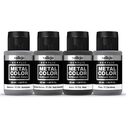 Comes with four 32ml bottle colors. Metal Color is a new range of water-based metallic colors, especially designed for airbrushing. In the development of these new and innovative metallic colors, the latest generation of aluminum pigments has been used in a specifically designed formula which results in a series of colors of exceptional resistance and adherence to plastics and metal. Metal Color can be applied directly on models without the need for the use of a primer, although in the case of fuselages and components for airplane models it is recommended to first apply a glossy Black Primer to bring forth the unique and special quality of the aluminum finish. The range of Metal Color consists of 19 references, available in 32ml. bottles with a flip top/eyedropper closure.