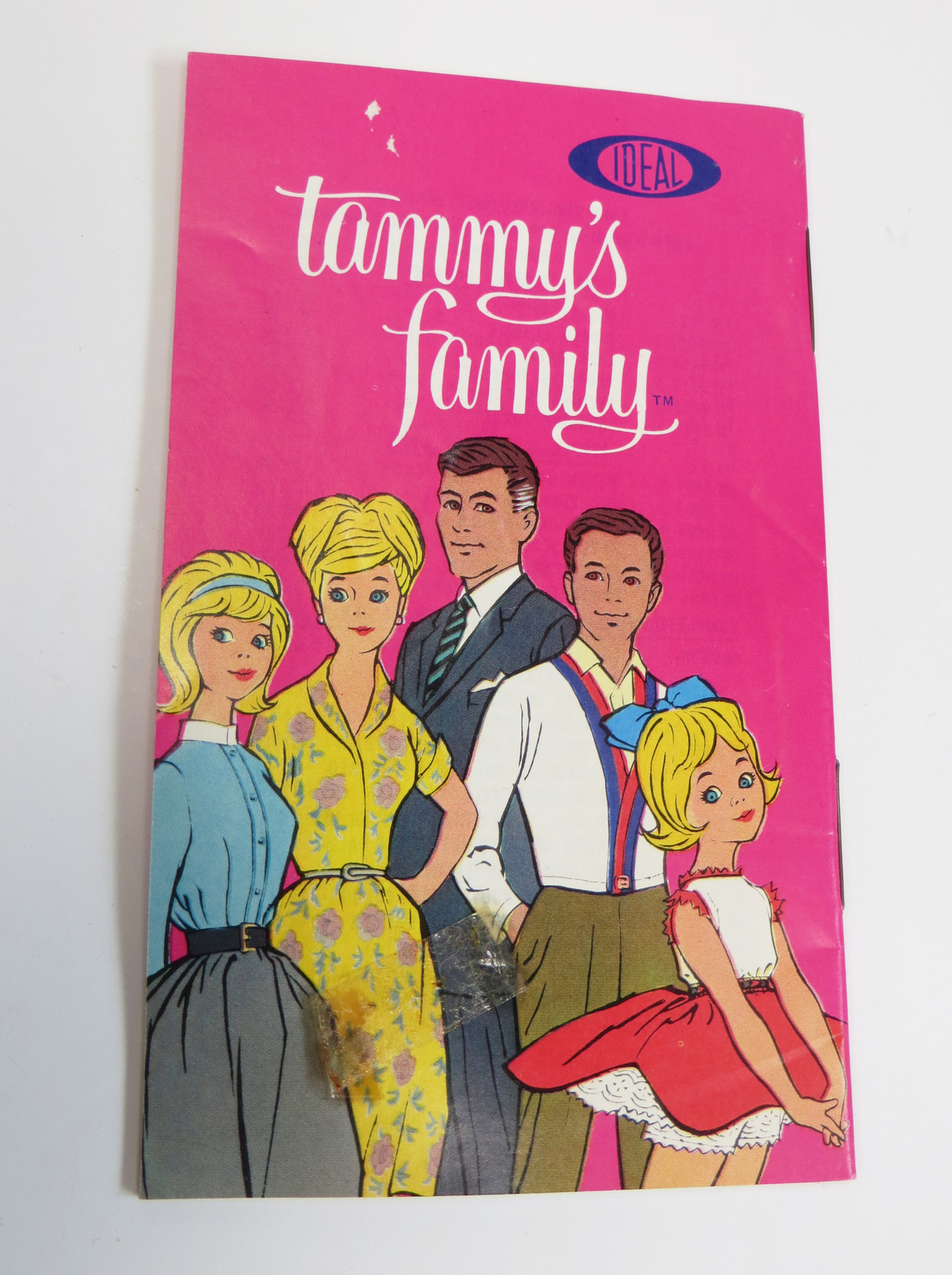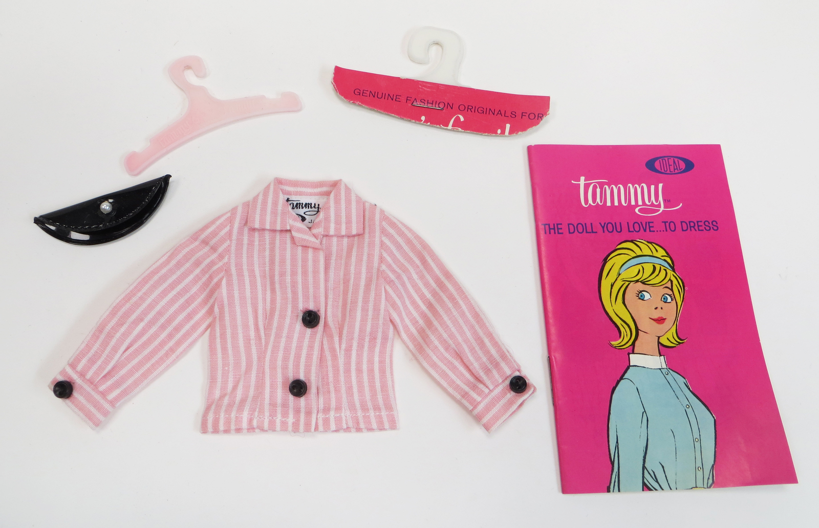 1960s Ideal Tammy pak clothing #9232-0 long-sleeve pink and white striped blouse with original black purse, hanger, and original hanging tab with a part of the top of the cardboard header still attached. Although pak clothing didnโt original come with a fashion booklet, one is included here. The blouse is in excellent/near mint condition. The booklet has some creases and on the back there is a piece of dried up tape residue and a couple of small nicks to the graphics of the pink background.