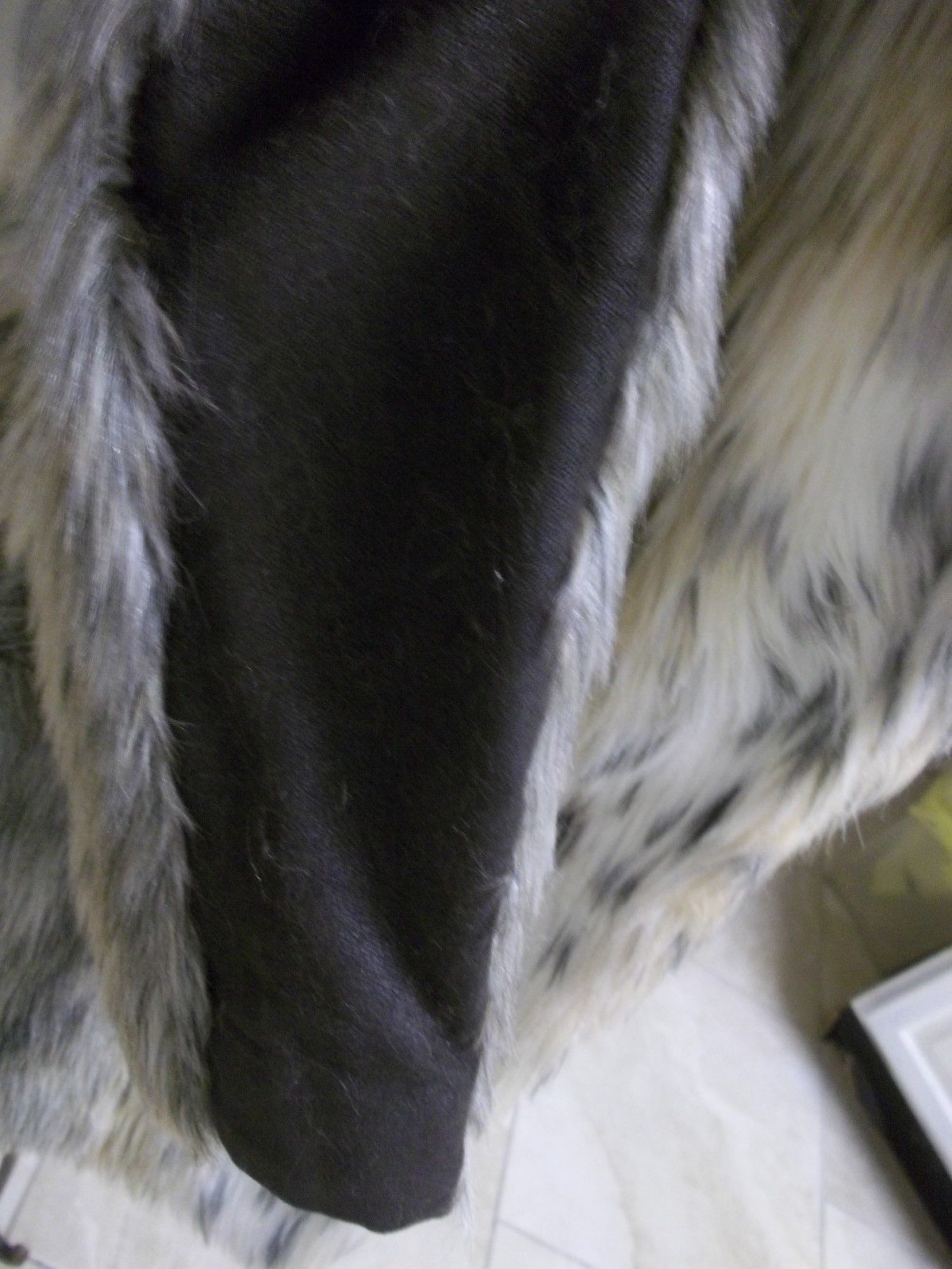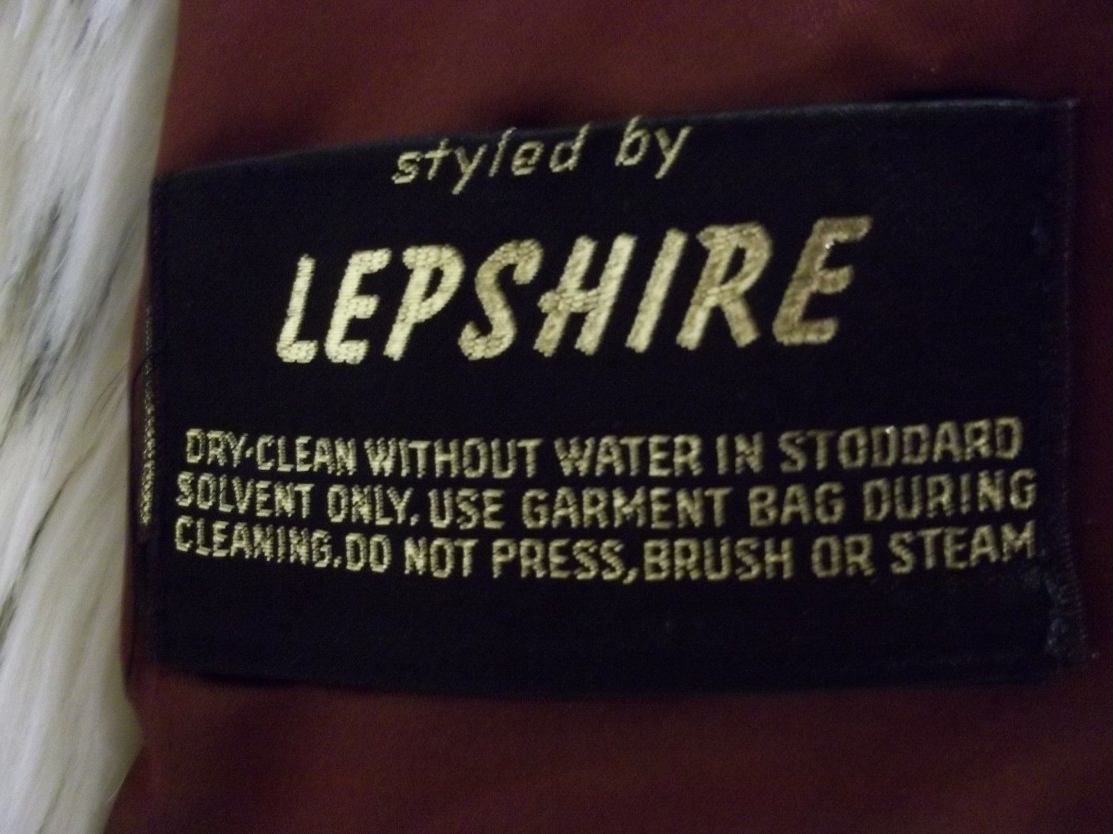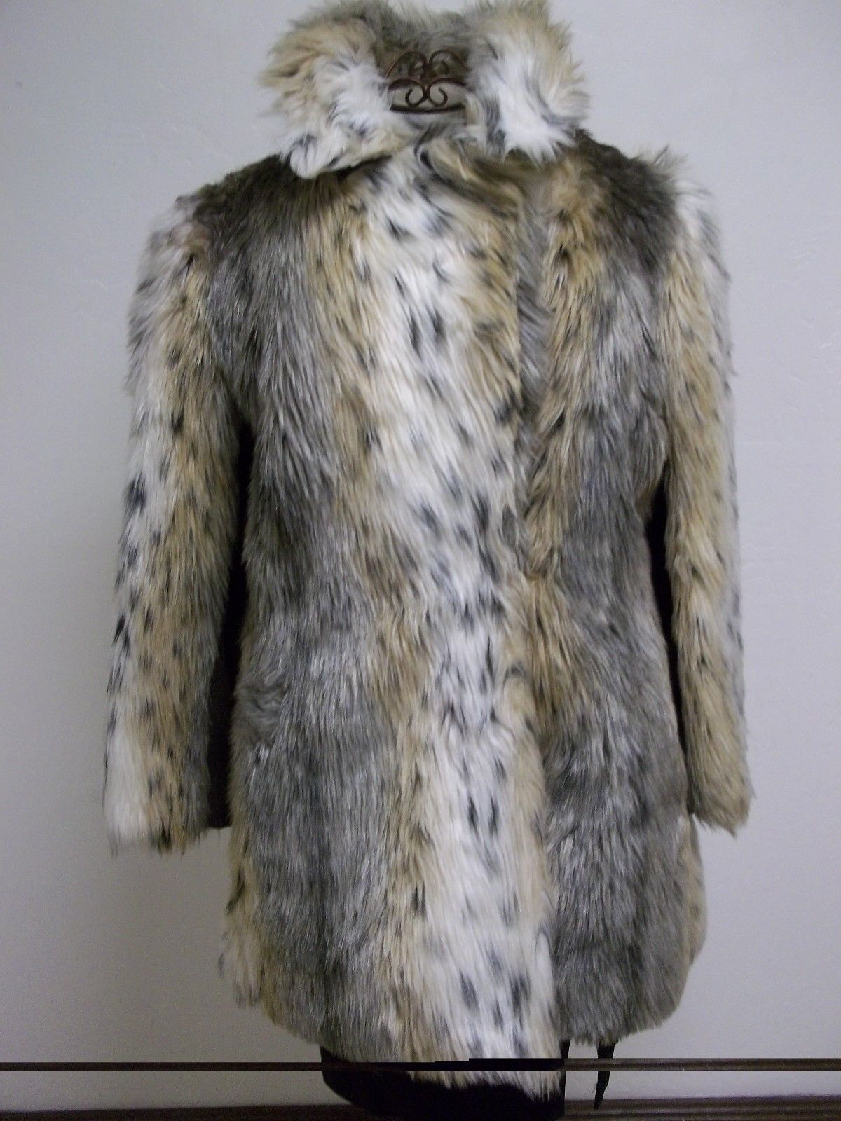 Gorgeous Tri Colored Faux Fur medium length coat, satin maroon lining, some staining, very silky, 1 furrier hook eye, inside exterior 24" sleeves lined with leather like material, same material on 2 1/2" trim inside coat and back of collar. As always, with gently previously loved vintage items, professional cleaning might be in order upon receipt, any noticeable imperfections, stains or odors are mentioned in listing.