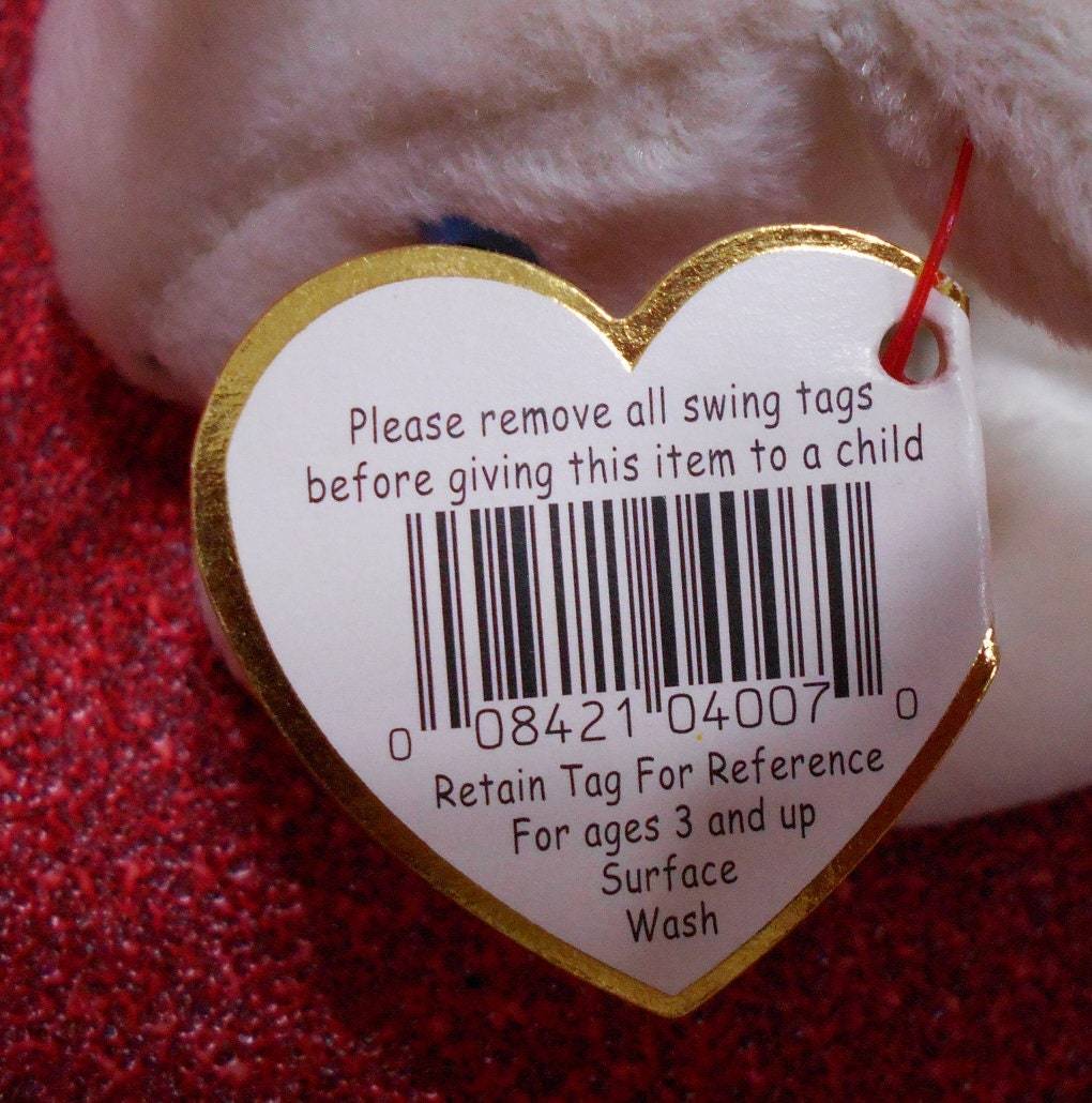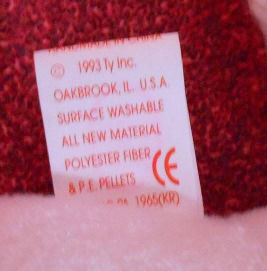 The Tush tag reads: Copyright 1993 Ty Inc. Oakbrook, IL. U.S.A.; Reg. No PA. 1965 (KR), which means for the Korean market. The Tush tag errors are: 1) Period after IL (Oakbrook, IL"." U.S.A.); 2) Missing a comma between Ty and inc.; 3) Reads: "P.E. Pellets ", which stands for Polyethylene. Either the periods should have been dropped, or and a period after the word pellet,; and, 4) Should have a period on the abbreviation for number (Reg. No "." PA.1965).