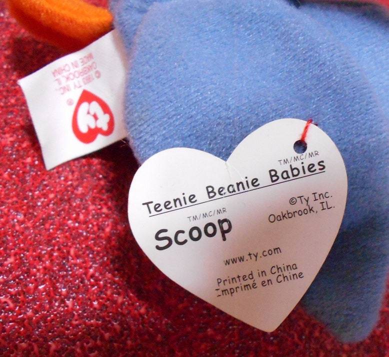 The Swing-Tag Errors: 1) Period after IL (Oakbrook, IL"." ); 2) Missing Comma between Ty and inc. Now the Swing tag has TM/MC/MR trade mark symbols above the word 'Babies', and the name 'Scoup'. That is a rare older style or design.