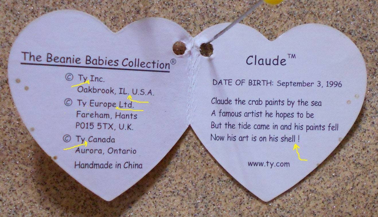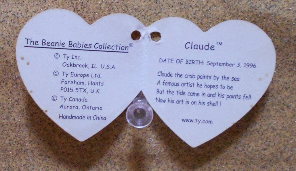 Ty "Claude the Crab" Beanie Baby w/ Tag Errors, Very RARE #4083, Old Vintage HK