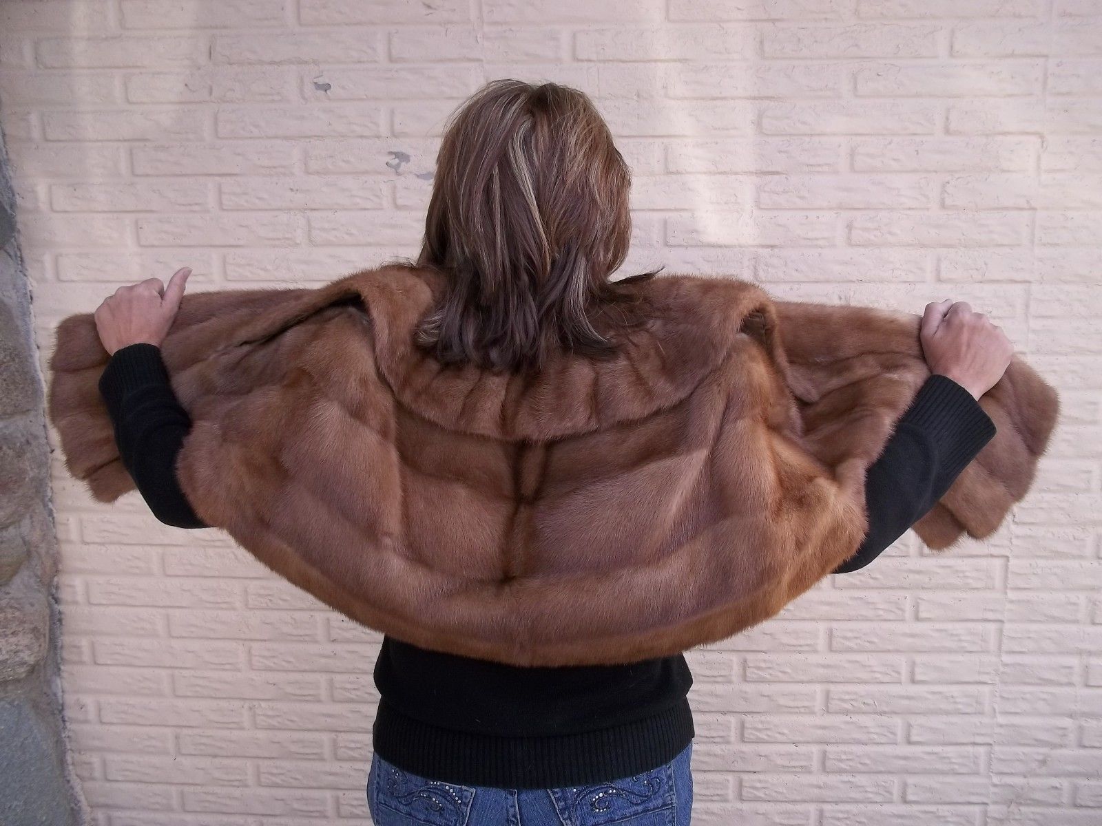 This elegant, vintage women's medium, light tan stole/wrap has a shawl collar, approximate measurements are, back of collar to hem 19", shoulder to shoulder 19", sweep 28", 2 front pockets.