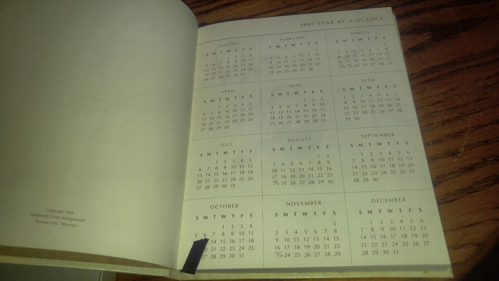 Here is a neat vintage 1969 Hallmark diary calendar. Unused. In original box. Some light wear and soiling from storage but overall nice shape for age.