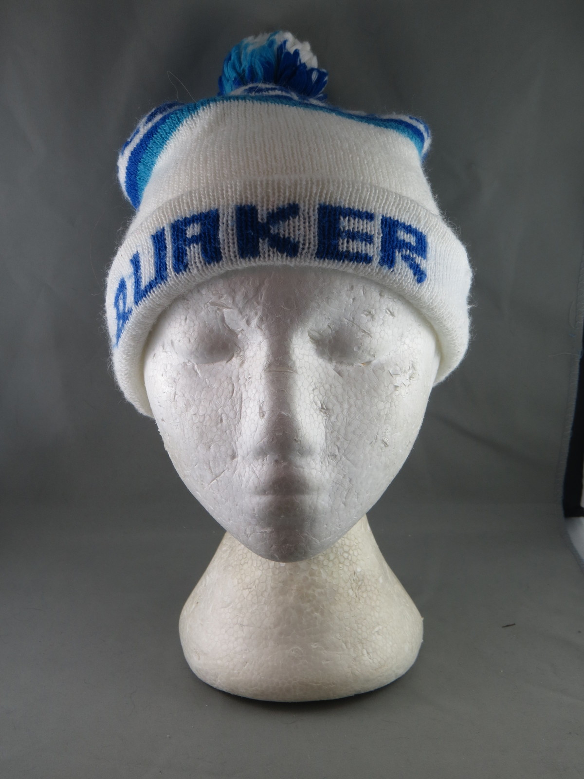 Up for sale is a vintage toque/beanie. It has a white base colour with a multi-colour pom-pom on top. The front and back of the toque on the roll-up has Quaker woven in blue while the midsection of the toque has blue jays woven in twice which wrap around the toque. What a great toque do not miss out on it.