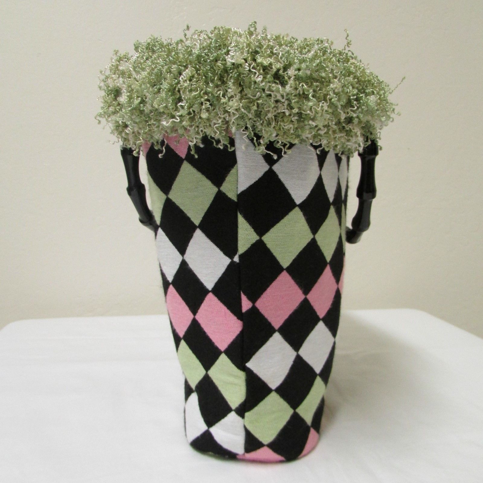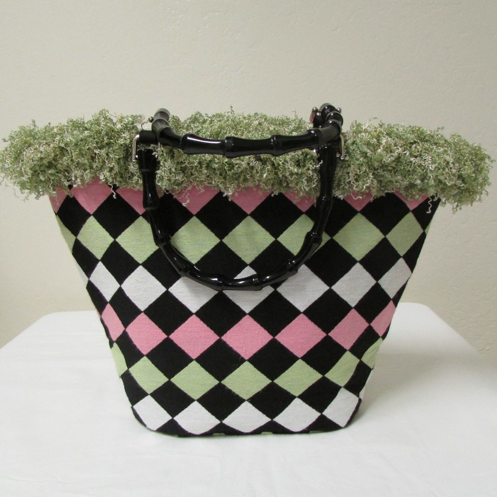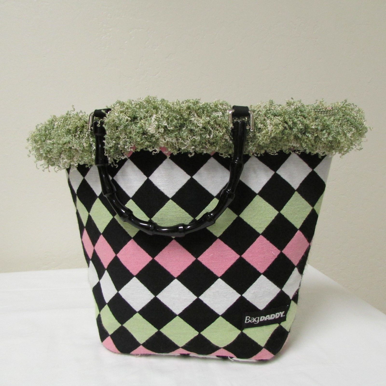 NWOT Bag Daddy Fabric Lime Green Pink Black Handbag Black Bamboo Style Handles