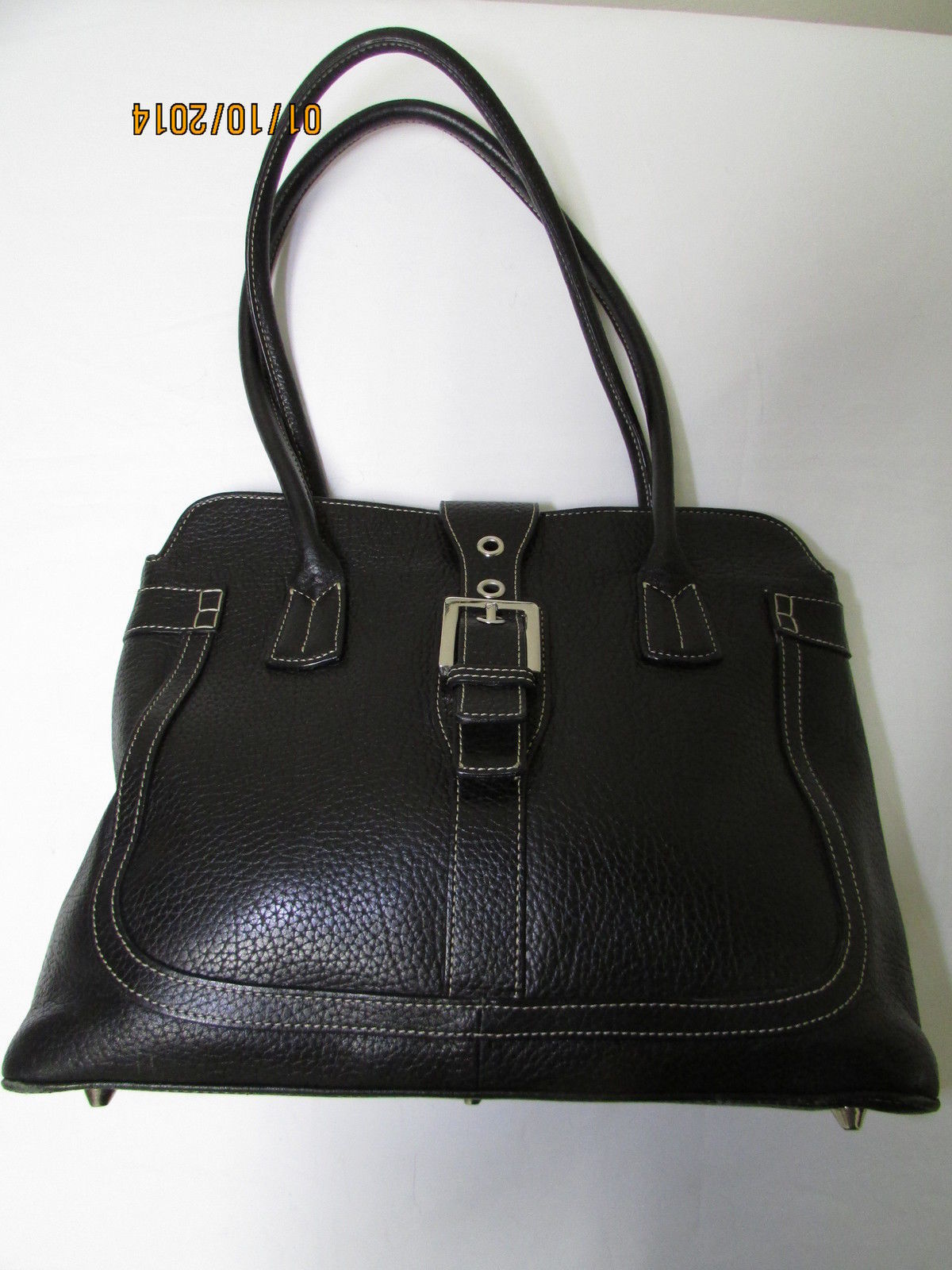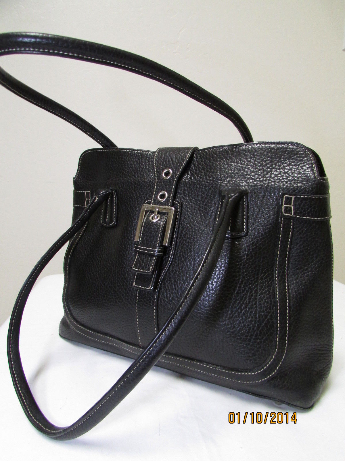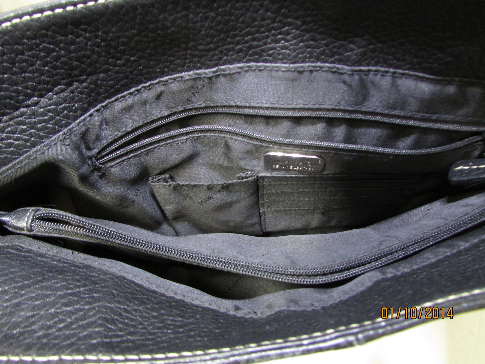 Beautiful, classic, Black Pebble Leather, Mila Paoli shoulder bag, fold over fashion buckle accent, snap clasp, center zip compartment, zip pocket and 2 open pockets on interior side section, silky soft, black, Mila Paoli interior lining, 5 feet on bottom which protect this wonderful bag from touching unwanted surfaces, excellent previously loved condition.