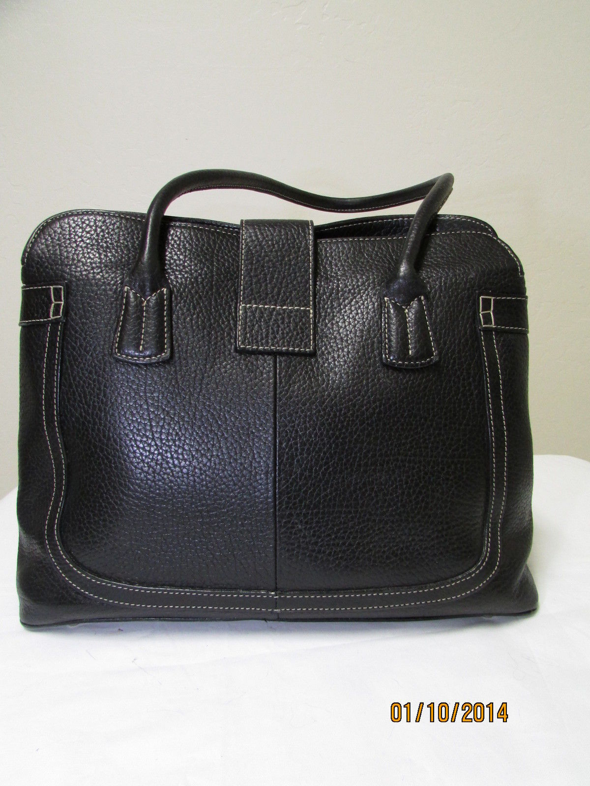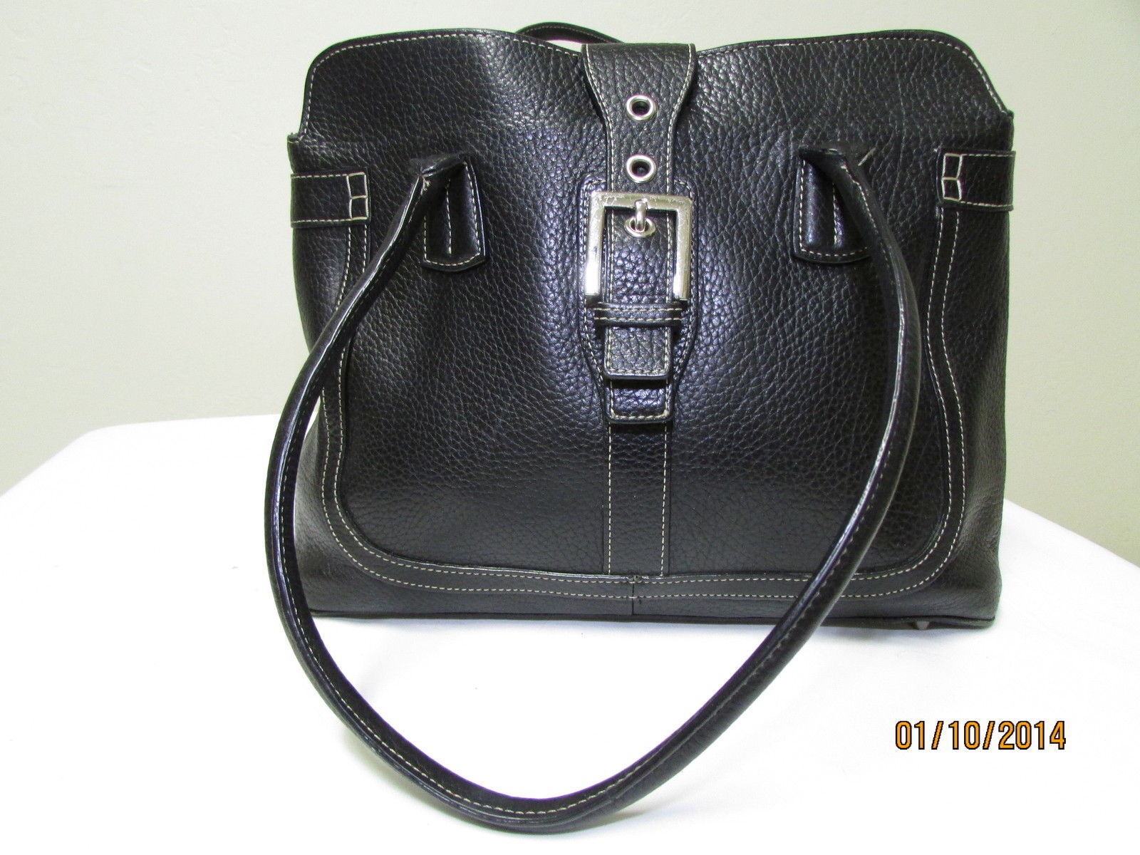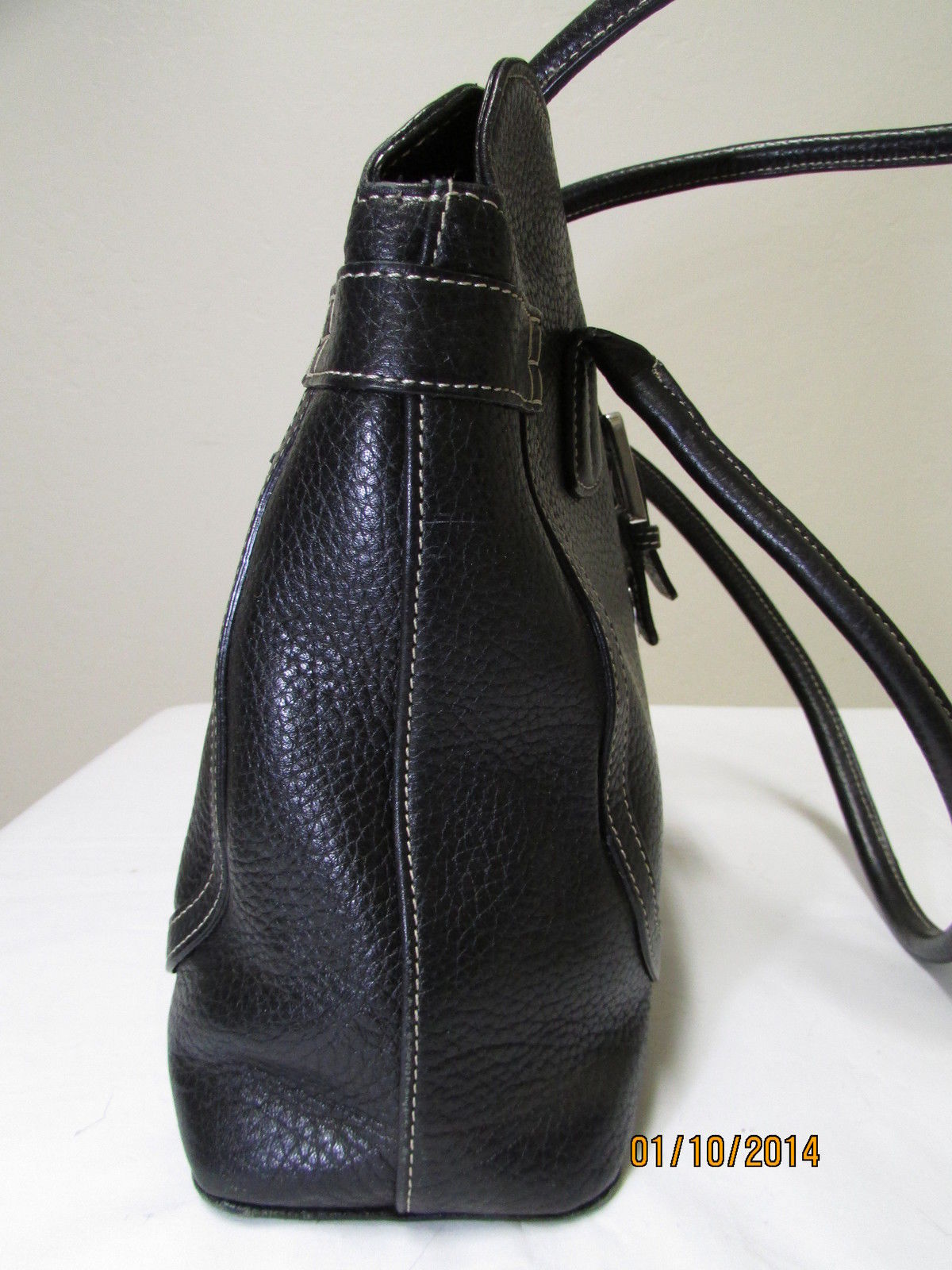 Beautiful, classic, Black Pebble Leather, Mila Paoli shoulder bag, fold over fashion buckle accent, snap clasp, center zip compartment, zip pocket and 2 open pockets on interior side section, silky soft, black, Mila Paoli interior lining, 5 feet on bottom which protect this wonderful bag from touching unwanted surfaces, excellent previously loved condition.