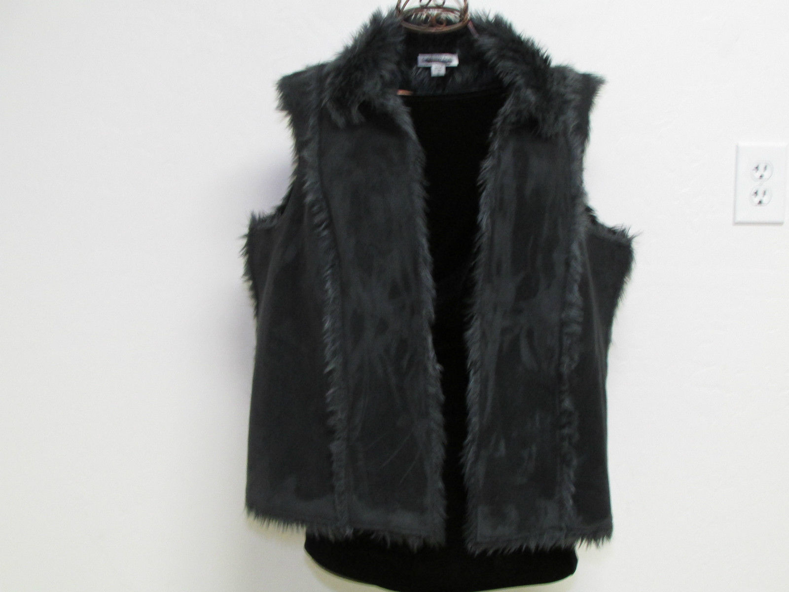 Beautiful vintage Coldwater Creek Faux Suede Leather Vest with Black Faux Fur, size 1X/18, features a rich classic flat black suede leather with a soft black faux fur lining and collar, open style front is meant to hang open with 1 furrier hook and eye closure, with any vintage garment, professional cleaning may be required upon receipt.