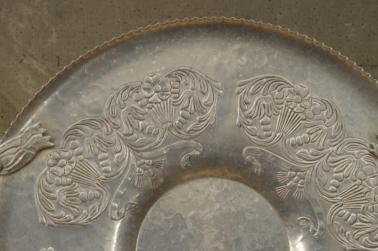MCM Mid Century Modern Aluminum Metalware La Bell Silver Company Serving Tray, embossed floral bouquet design. Raised floral handles. Round tray measures 13-5/8" across. Recessed center would hold a bowl nicely to convert into a chip/dip setup for a buffet. No smoke or pet odor.