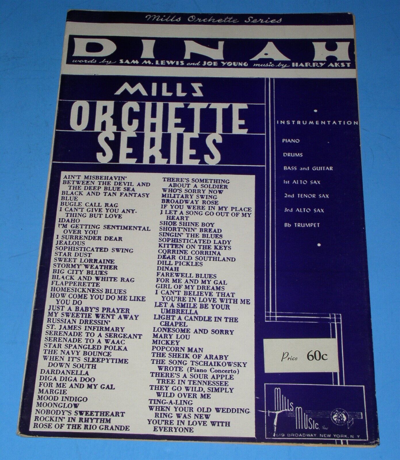 This is an original, vintage piece of sheet music for the song, "Dinah". Dated 1931 Mills Music Inc. Libretto style with individual arrangements for 3rd Saxophone Eb Alto and Bass. From the Mills Orchette Series.