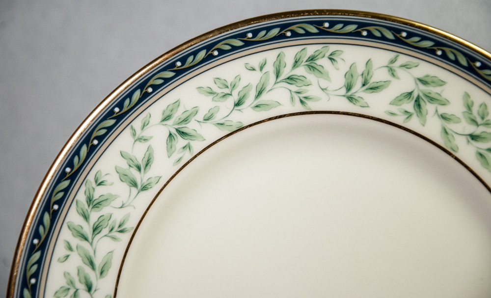 Royal Doulton 8" Oregon salad or dessert plate from the New Romance Collection. This fine china plate is decorated with green laurel leaves, a blue band and gold trim. This pattern was produced from 1998 - 2001. This plate is pre-owned, but in excellent condition. There are just a few very slight marks on the surface and there is minimal wear to the gold trim.