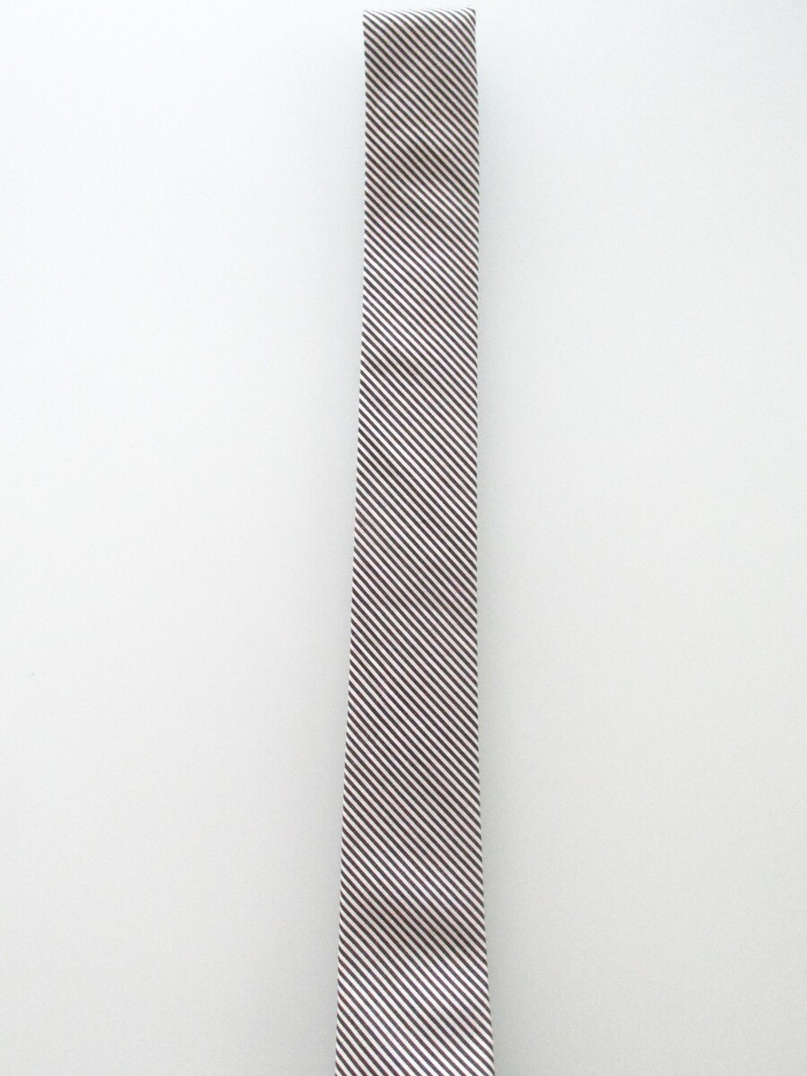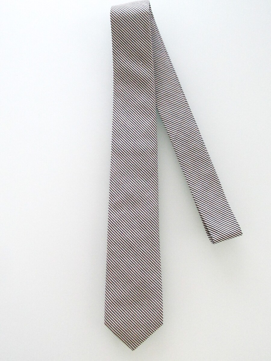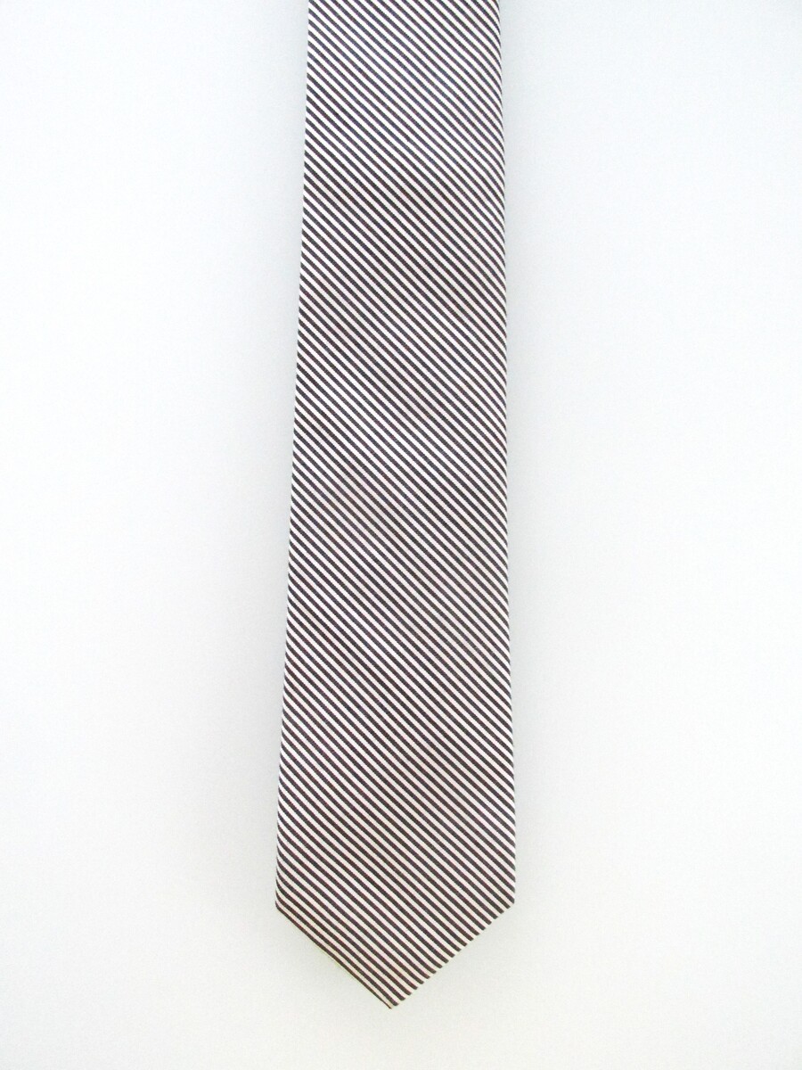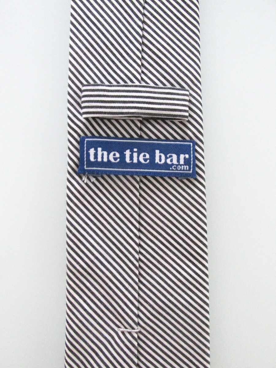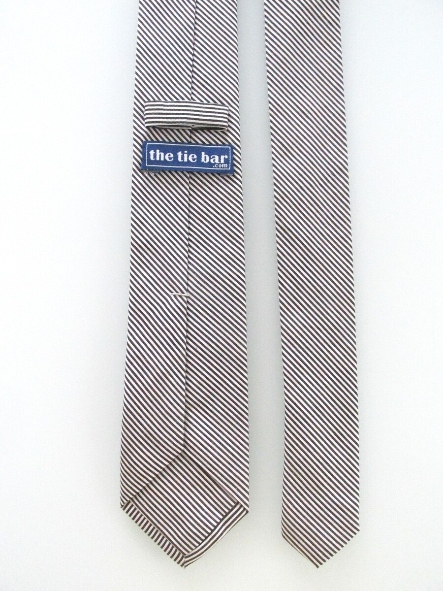 Description: Up for sale is a Tie Bar men's narrow/skinny cotton tie. The tie is handmade in the USA of 100% cotton. Dimensions are approximately 56" long x 2.50" wide. The tie has a gray white striped pattern. This tie is in like new condition.