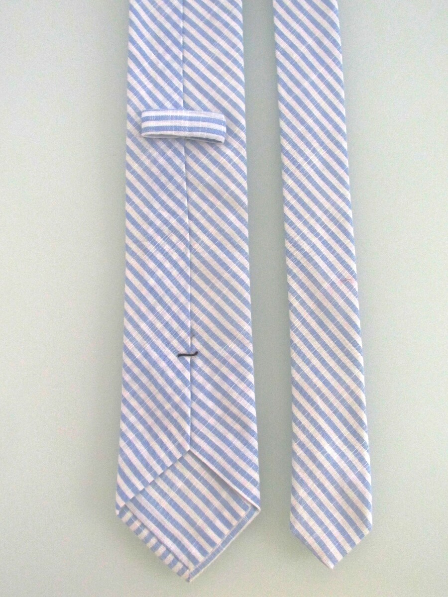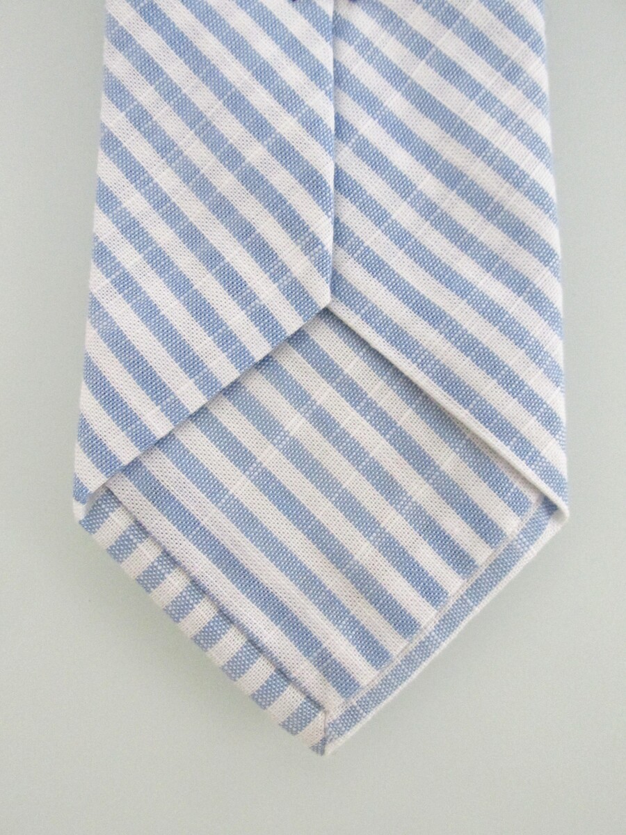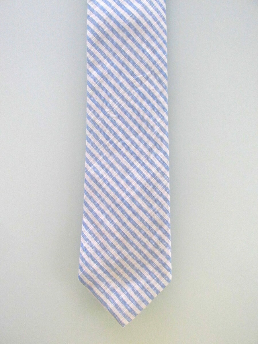 Description: Up for sale is an unbranded men's narrow cotton striped tie. The tie is handmade of 100% cotton. Dimensions are approximately 58" long x 3.00" wide. The tie has a pale blue white striped pattern. This tie is in excellent condition.