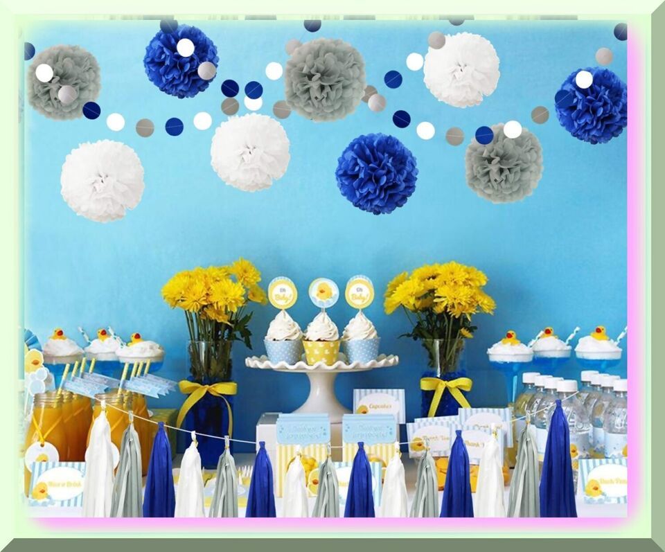 "Chic Navy Blue Grey White Tissue Paper Flower Pom Poms Party Decorations Kit -