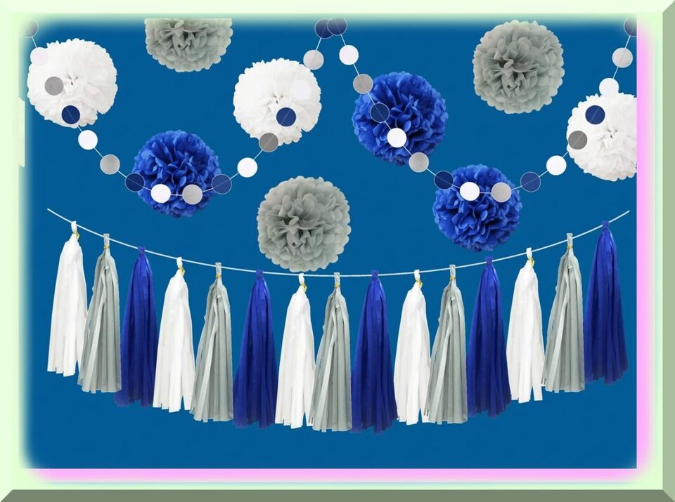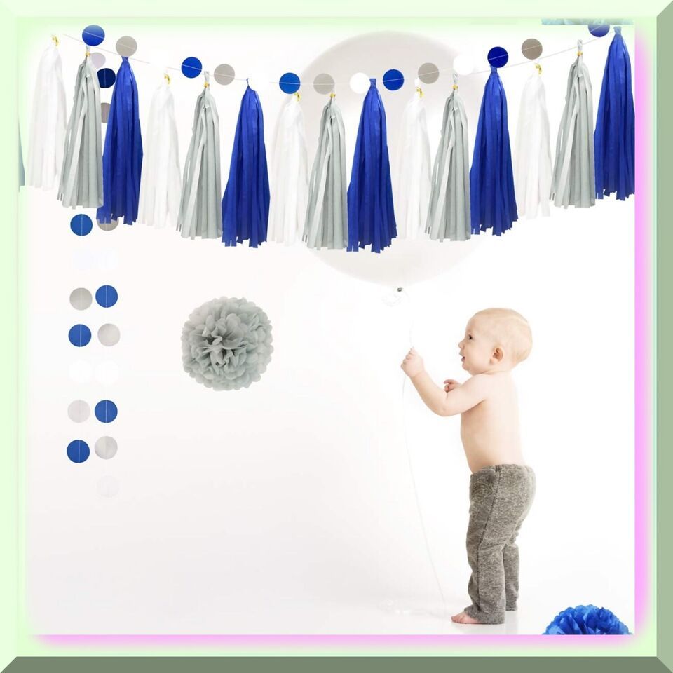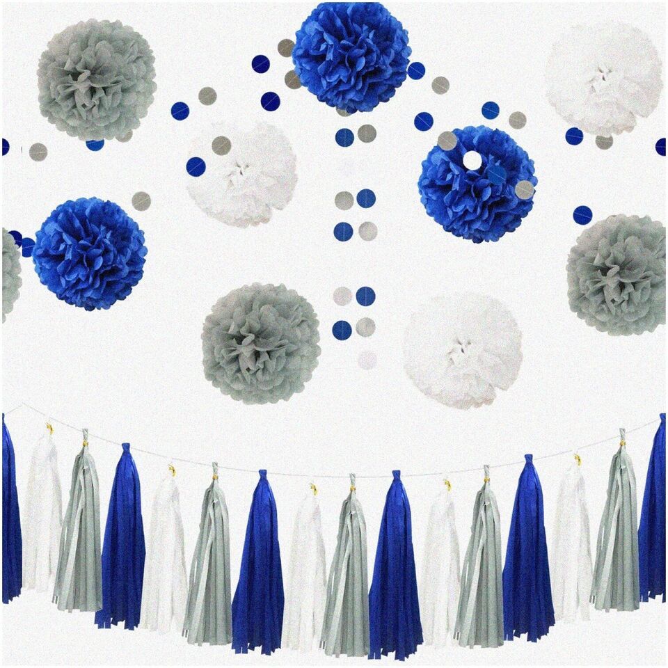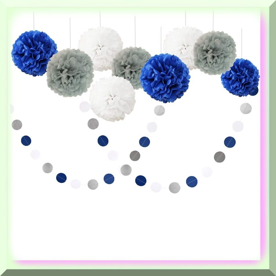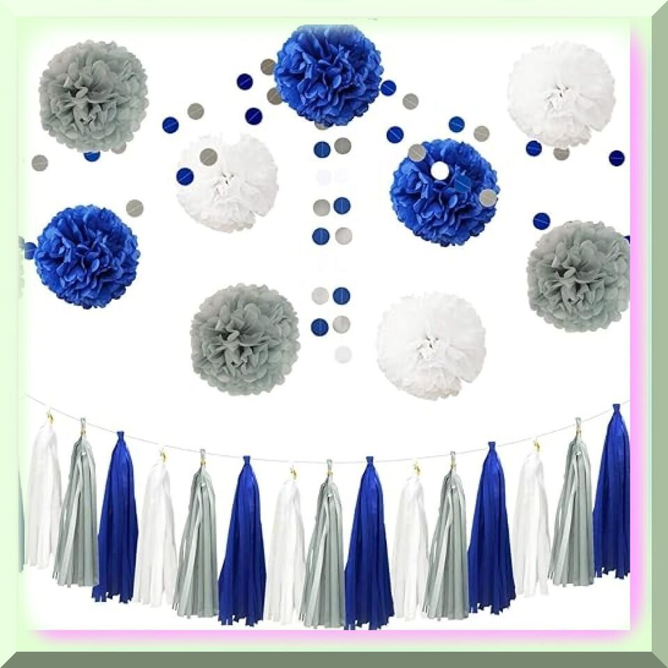 Get ready to elevate your party decor with our amazing package! It includes a stunning assortment of 8", 10", and 12" tissue pom poms in royal blue, gray, and white. Add some flair with our paper tels in matching colors. Hang our 6.5 feet circle dot garlands in royal blue, gray, and white for a touch of elegance. Please note that all items come in flat packaging, but don't worry, strings are included and it's DIY time! Double-check everything upon arrival to avoid any delays. Please keep in mind that colors may vary slightly from the photos due to differences in color display. Enjoy your party stress-free with our 30-Day Money-Back Guarantee and our friendly customer service. Click the link above to explore our party supplies in more styles and colors. Let's make your party unforgettable!