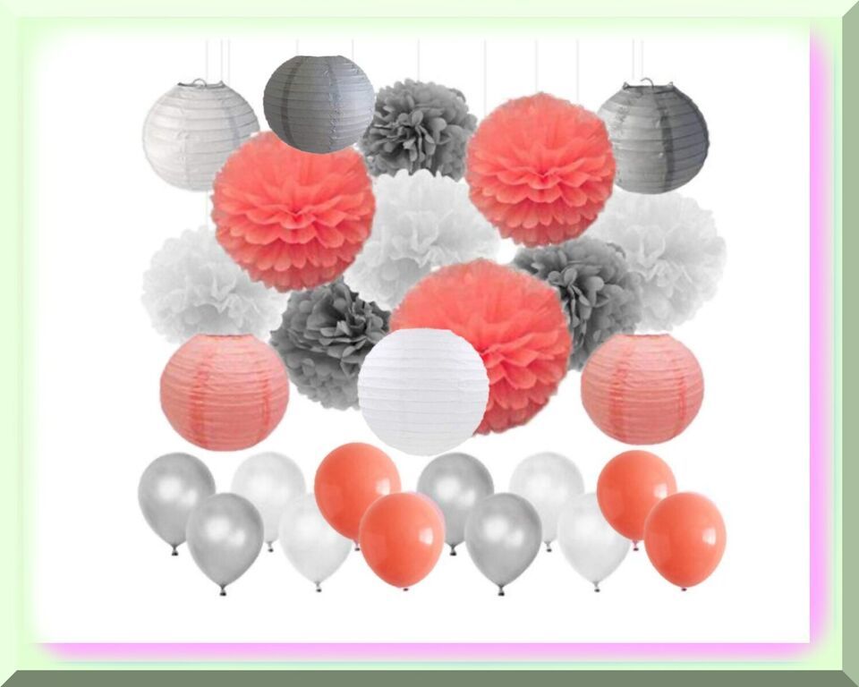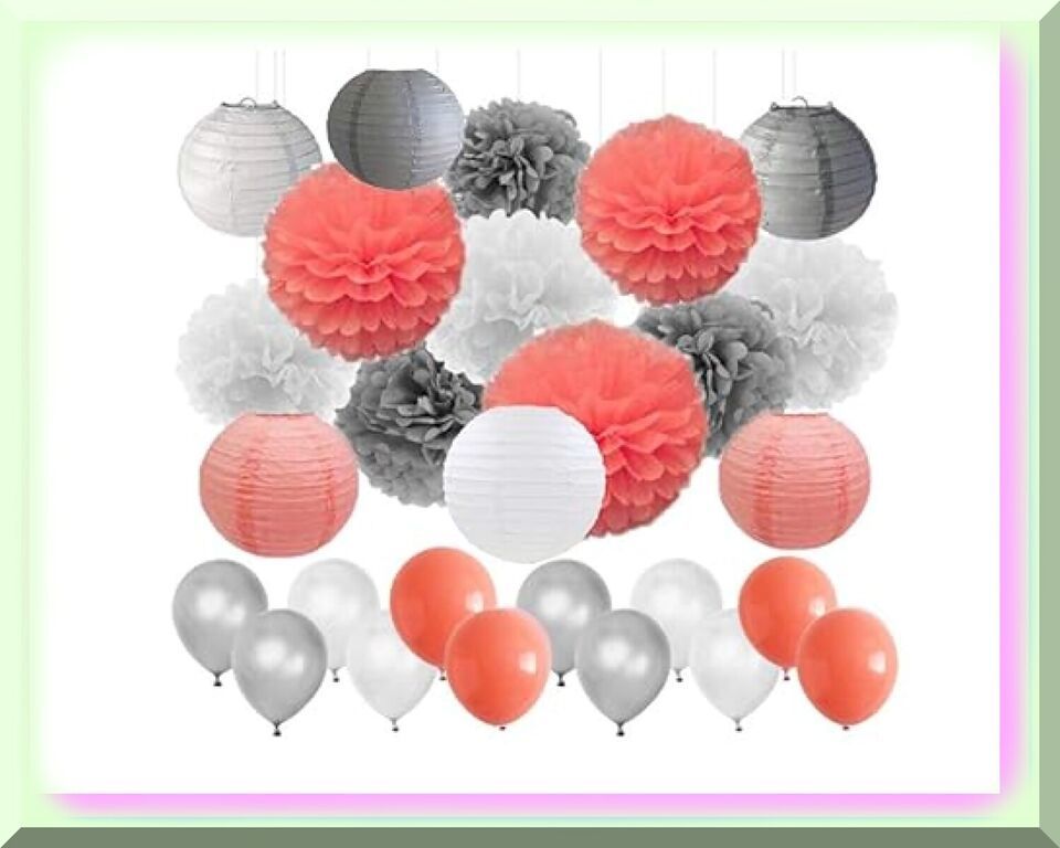 Enhance your event decor with our stunning assortment of 6pcs 8inch paper lanterns in vibrant Coral, elegant White, and sophisticated Grey. Complementing these are 9pcs tissue paper pom poms in Coral, White, and Grey, ranging from 3 to 8 inches in size. To add a touch of whimsy, we also offer 6pcs 10 inch tissue paper flowers and 30pcs 10 inch latex balloons in Coral, White, and Grey. These decorations are conveniently pre-folded and pre-cut, making assembly a breeze. Hang them effortlessly from ceilings, tables, walls, chairs, or even the branches of trees. They also make stunning table centerpieces that are sure to leave a lasting impression on your guests.