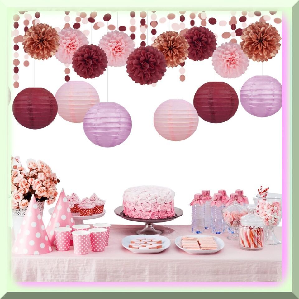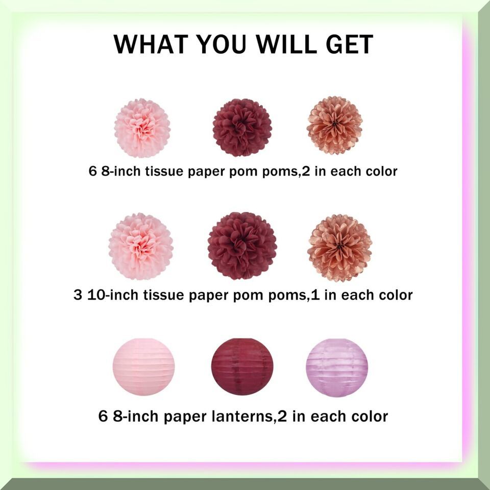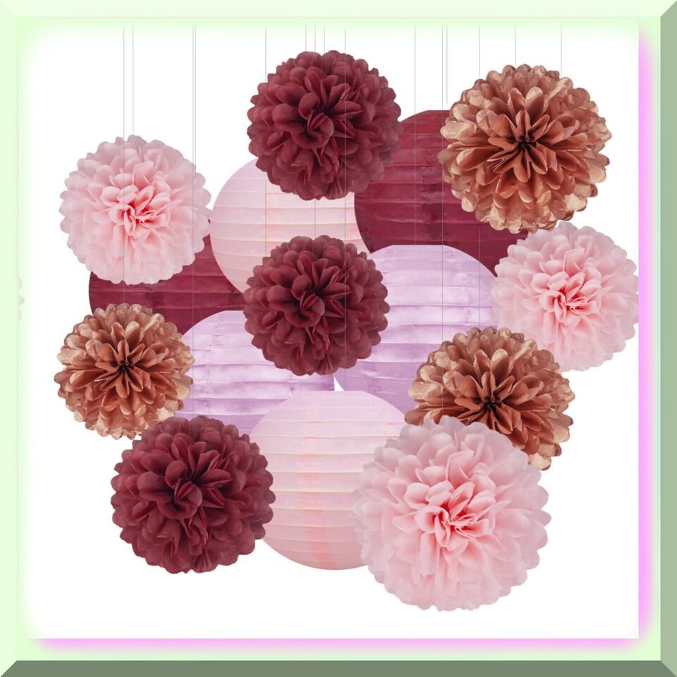 Rose-Gold Pink Burgundy Party Bliss Kit: 15Pcs Tissue Pom Poms, Paper Flowers &