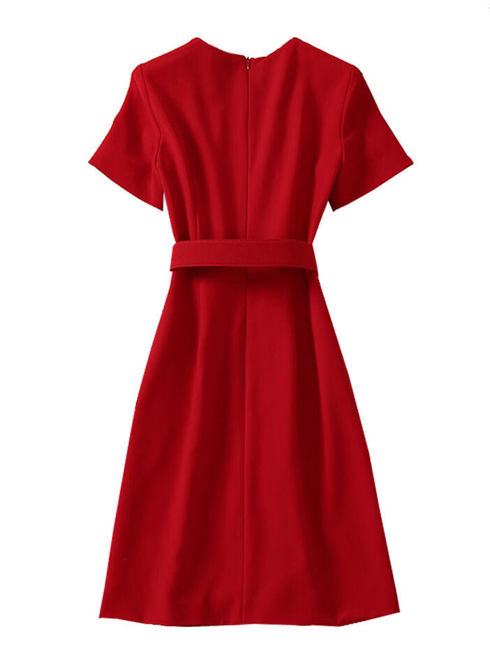 Crafted from high-quality polyester crepe fabric, our dress is inspired by Catherine, the Princess of Wales's iconic style. Featuring a flattering pleated neckline, short sleeves, and a concealed zip fastening at the back, this dress comes complete with a self-colored belt and is fully lined for added comfort.