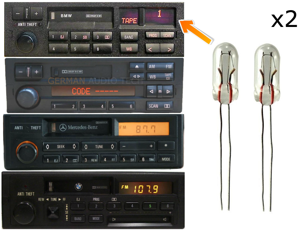 Having issue with the digital display on your factory radio? This is common problem for factory Alpine and Pioneer model radios from the 1980s through early 2000's. Luckily you can repair it yourself by simply replacing the light bulbs that have burned out. This listing is for (2) High Quality, wheat bulbs for your OEM cassette radio.