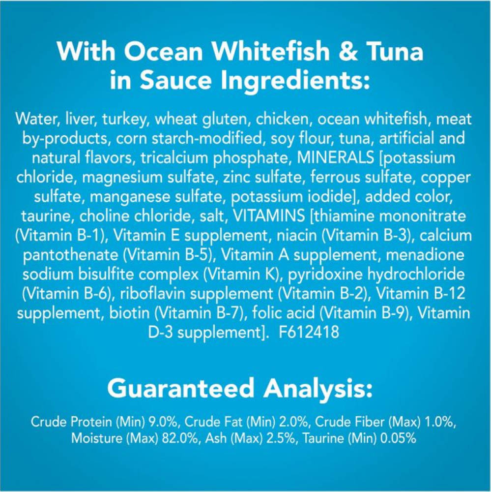 Quench your cat's cravings for seafood flavor when you serve Friskies Shreds With Ocean Whitefish and Tuna in Sauce Wet Cat Food. Real chicken and salmon in this cat food deliver the taste kitty loves while letting you feel good about giving them a meal made with high-quality ingredients. Each bite of the wet cat food features tender shreds for a texture your cat can sink their teeth into. A savory sauce in this healthy wet cat food balances out the recipe, providing added moisture and flavor!