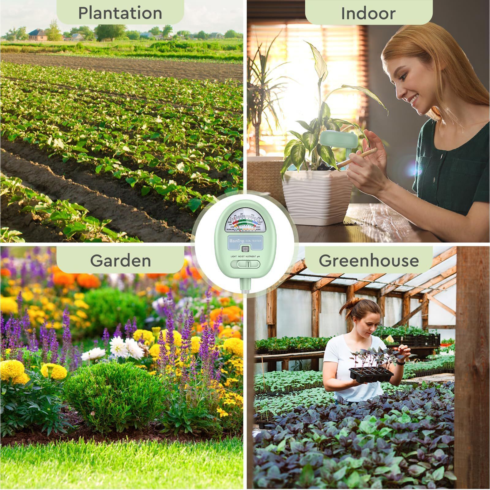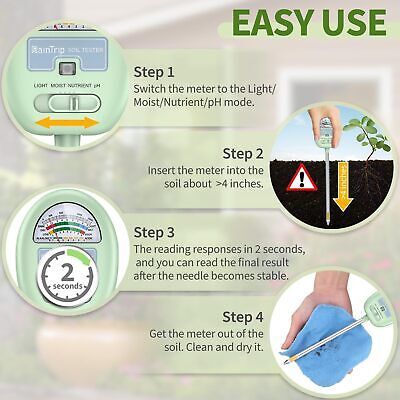 Color: greenFeatures: Free Plant Growing Guide Free Sandpaper 4-in-1 Multi-Function: This hygrometer can meet your needs to measure soil moisture, Ph, nutrients, and light conditions at the same time. Cost-effective, compared with the traditional single-function soil tester, you only need to buy one, and you can enjoy four services. It can help you gain a complete understanding of your plants Single-probe Design: The single-probe with upgraded material. Compared to traditional dual probes, a single probe can reduce damage to plant roots when inserted into the soil and is a reliable Plant Care Tool Fast Response: You only need to insert the probe deeper than 4 inches into the soil and get test results in seconds (must be greater than 4 inches deep) Patented Design US No.D968976: The patented design of the 90 rotating head allows you to read the dial without bending down and looking down. You can bend the head 1-90 at will. Adjust to the angle that best suits your reading No Batteries Required: easy to store. Great for Garden, Lawn, Farm, Indoor Outdoor Use. If the tester doesn't work, try sanding the tip and pole Package Dimensions: 10.9 x 2.8 x 1.6 inches