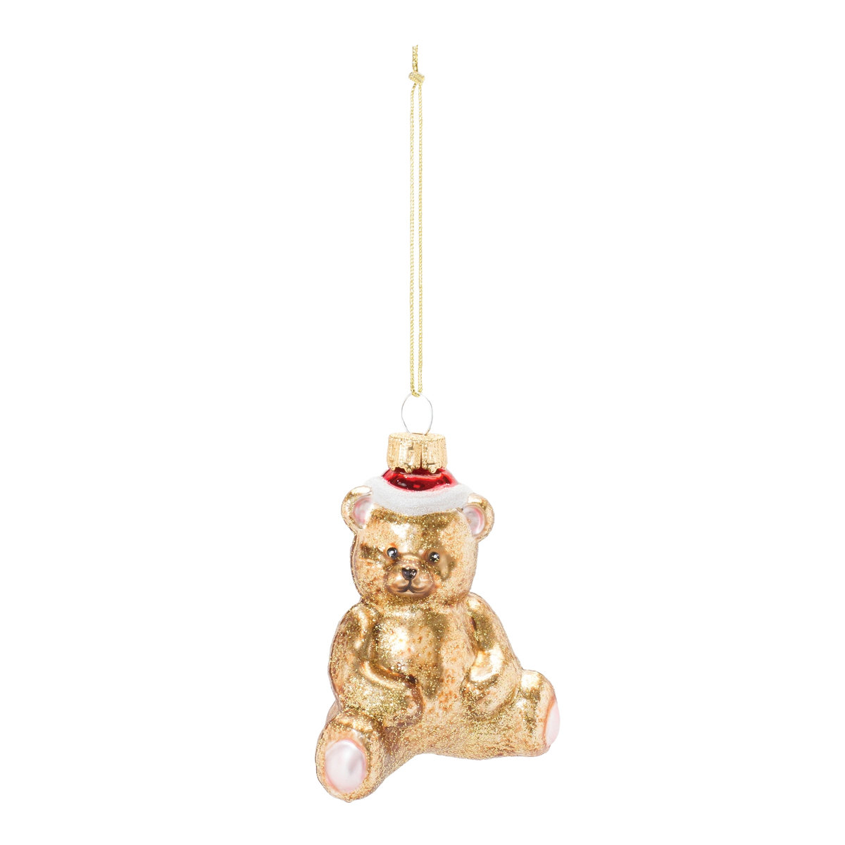 Set of 12 Glass Teddy Bear Ornaments: A whimsical collection of playful teddy bears, perfect for adding a charming touch to your Christmas tree. Elegant Gold Red Design: Features a sophisticated color combination with glittered accents and cozy Santa hats, bringing warmth and festivity to your decor. Durable and High-Quality Craftsmanship: Made from fine glass, these ornaments are designed to last through many holiday seasons, with a delicate gold string hanger for easy display. Suitable for indoor use only