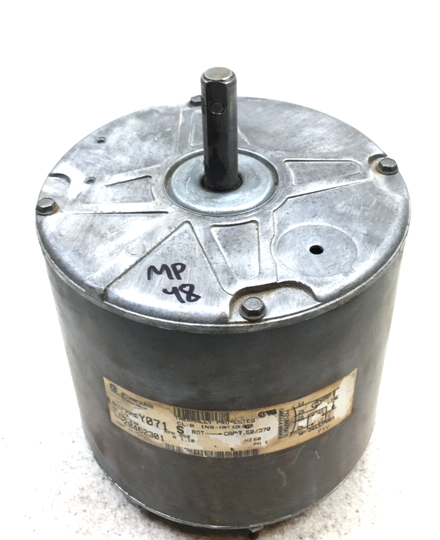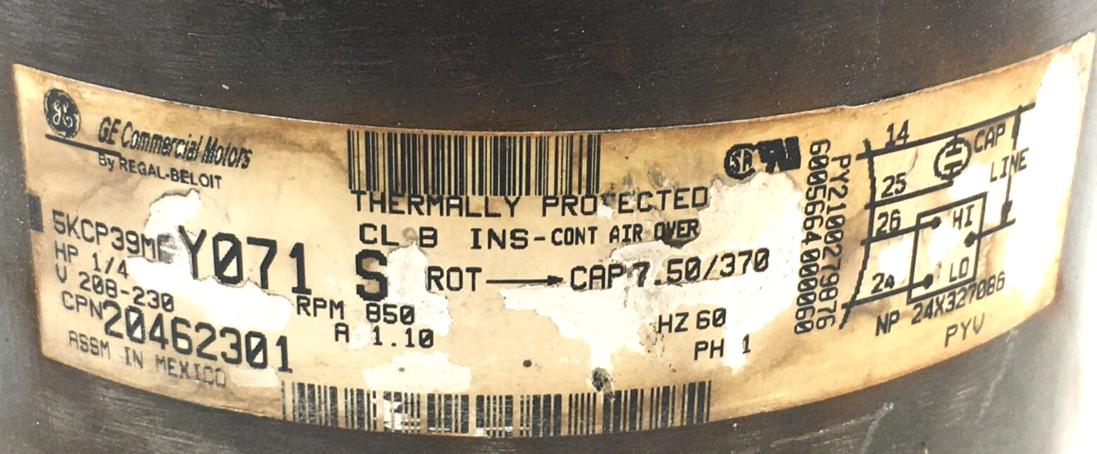This is GE 5KCP39MFY071S Condenser Fan Motor for Goodman 20462301 1/4HP 208/230V 850 RPM used part.