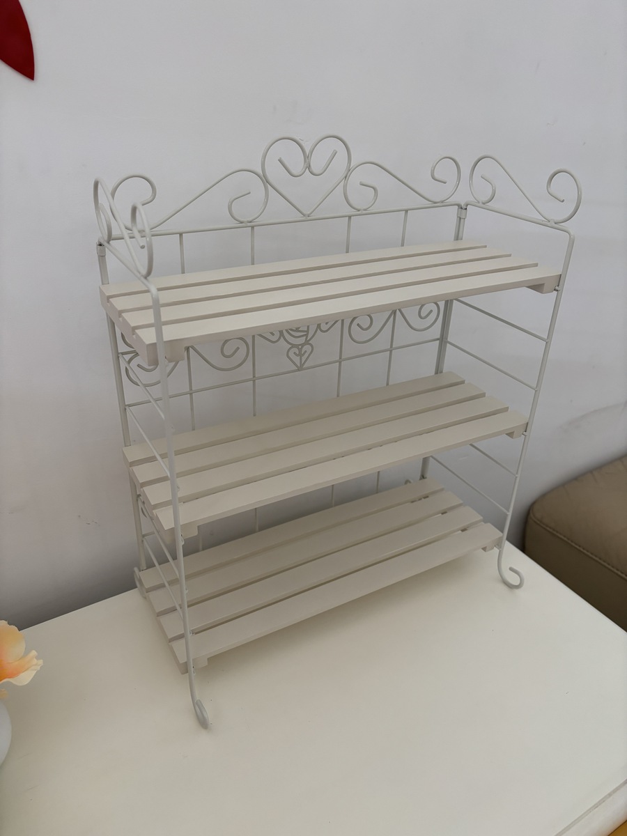 Three-layer shelf, made of iron and wooden strips, simple and practical, easy to install without tools, can be folded and moved, used to place accessories in the living room, cosmetics and small objects in the bedroom, seasoning bottles, tableware, etc. in the kitchen