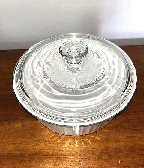 This is the CLASSIC CorningWare French White 1.5 Quart Round Baking Dish, complete with a Pyrek glass lid.
