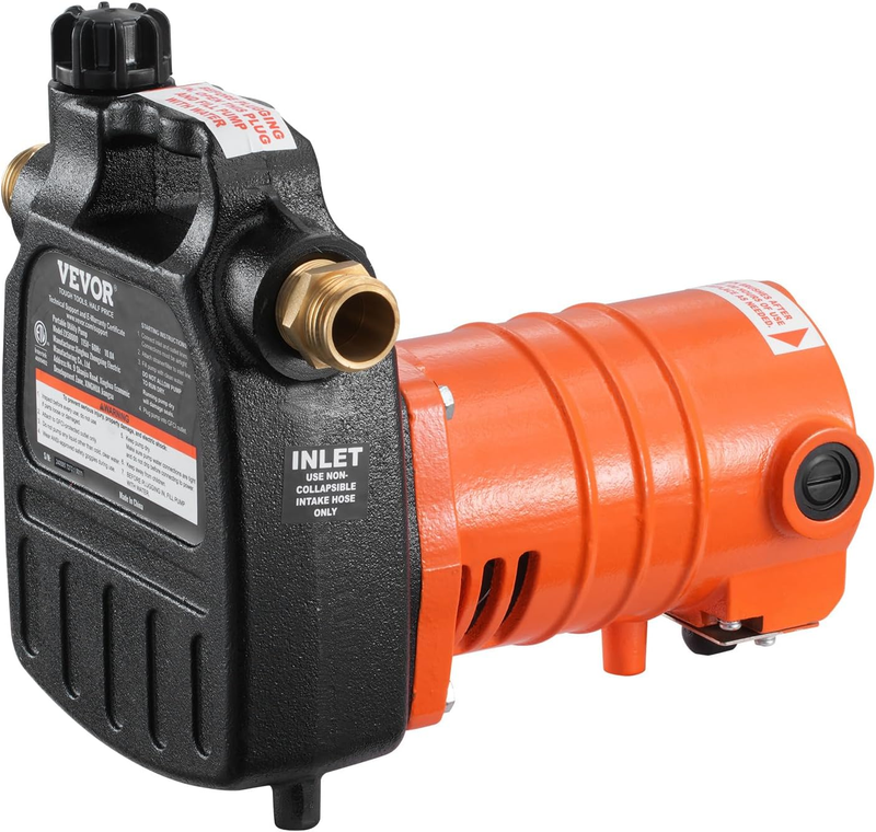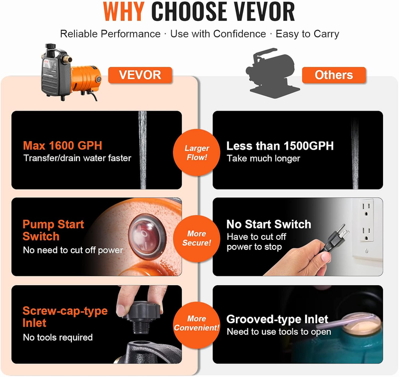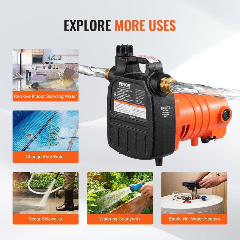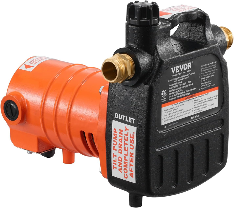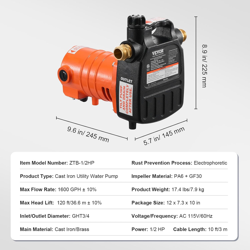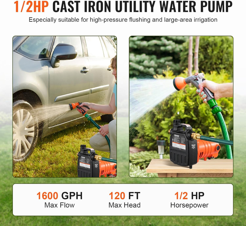 Say goodbye to weak water flow thanks to the VEVOR cast iron water transfer pump with 1/2HP power! This game-changing pump provides a flow rate of 1600GPH and can lift water to 120 ft high. It's perfect for high-pressure flushing, irrigation, indoor water drainage, and more. Get pumped with VEVOR!