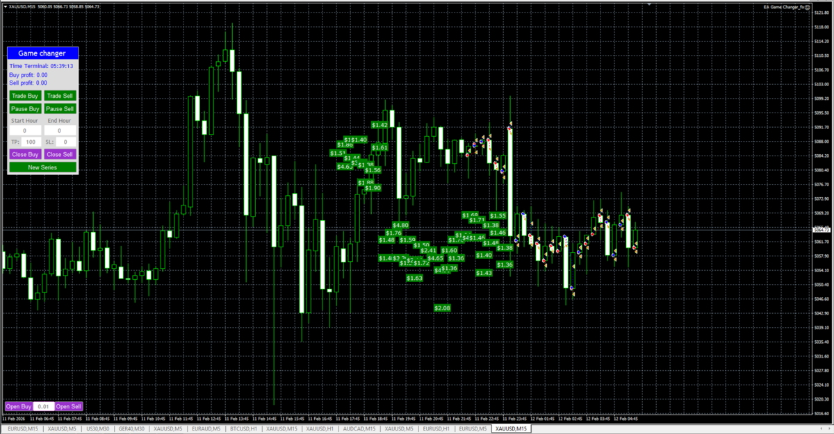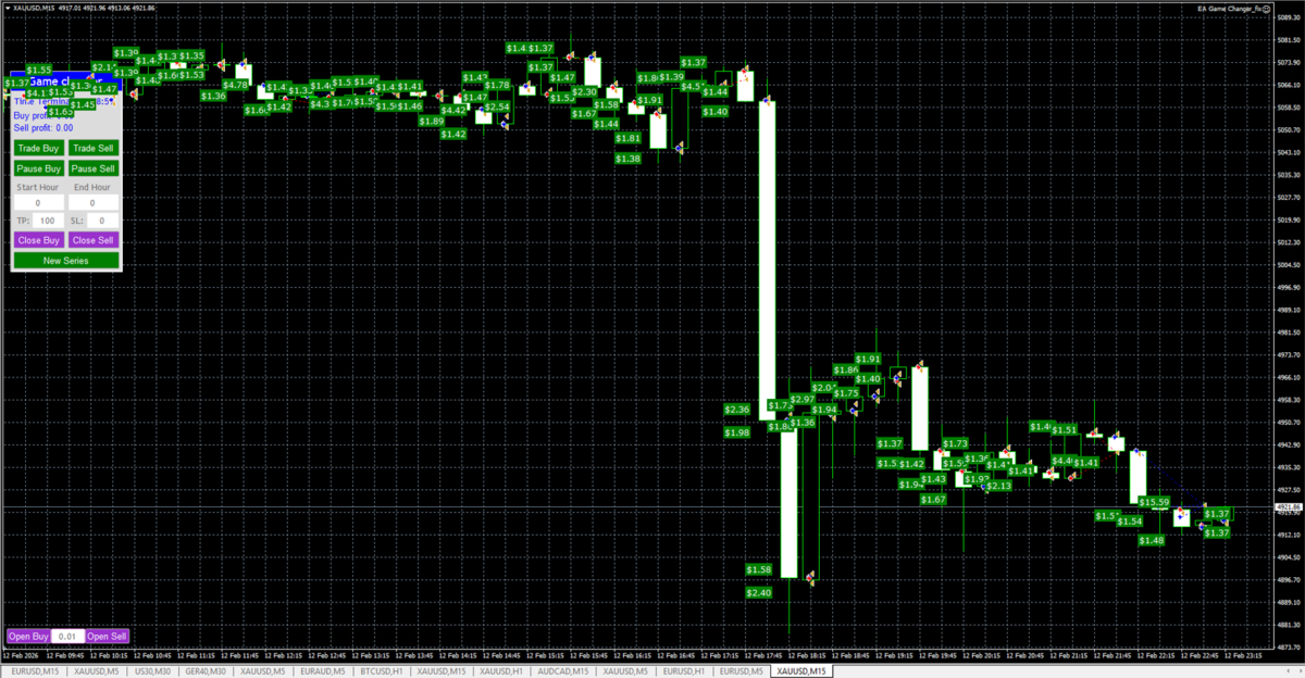 Though functional on any pair, Game Change EA performs exceptionally well on strongly trending instruments, especially XAUUSD on the M15 timeframe – a market known for prolonged directional moves.