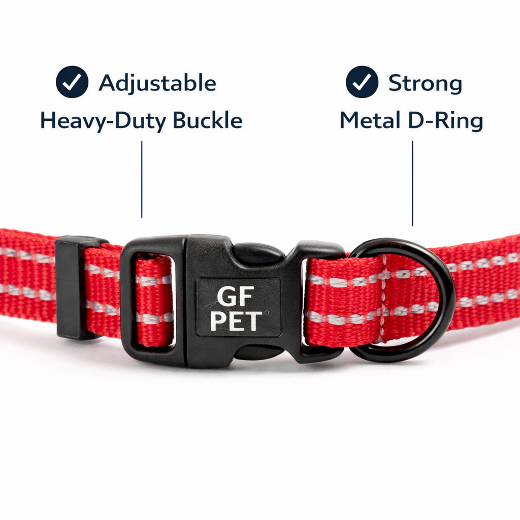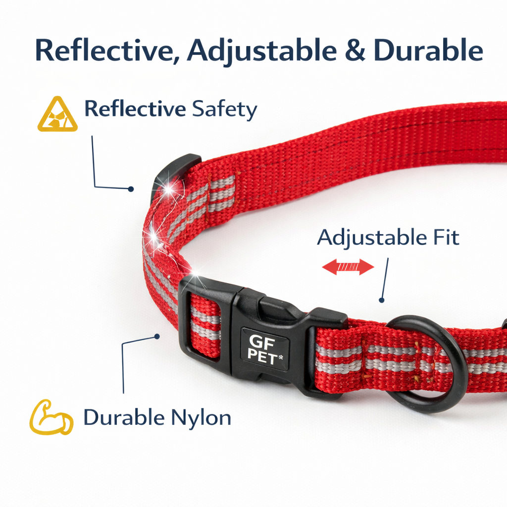 GF PET Reflective Dog Collar – Adjustable Nylon, High Visibility, Red (XS–L Wide)