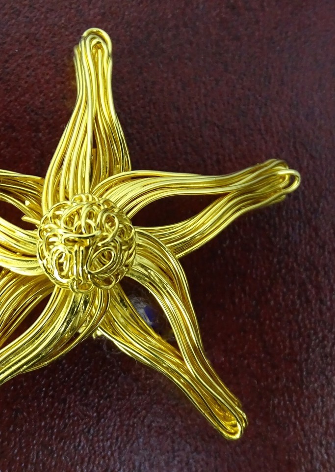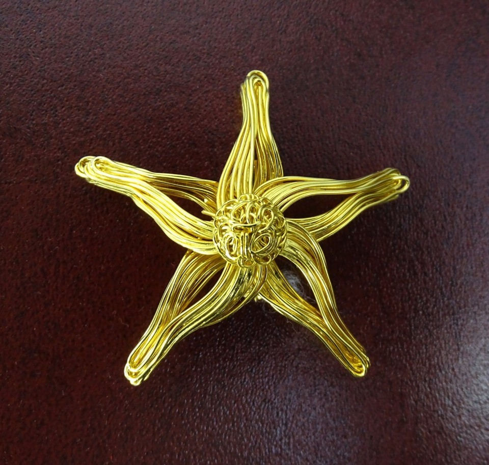 Gold tone metal wire that has been twisted into a pretty star shape. Different for Christmas. One owner family piece, not abused. Belongs to my mother who always treasured her jewelry pieces and did not abuse them. Her recollection is that it is from the 1970's. It could be even older.