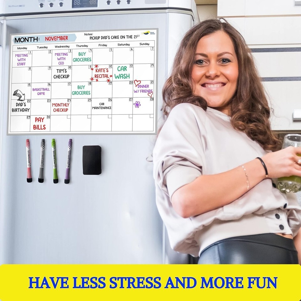 A perfect tool for moms, dads, families, coworkers, students, teachers, or anyone looking to enhance their organizational skills. Let our magnetic dry erase calendar board lighten your load, allowing you to cherish precious moments with loved ones.