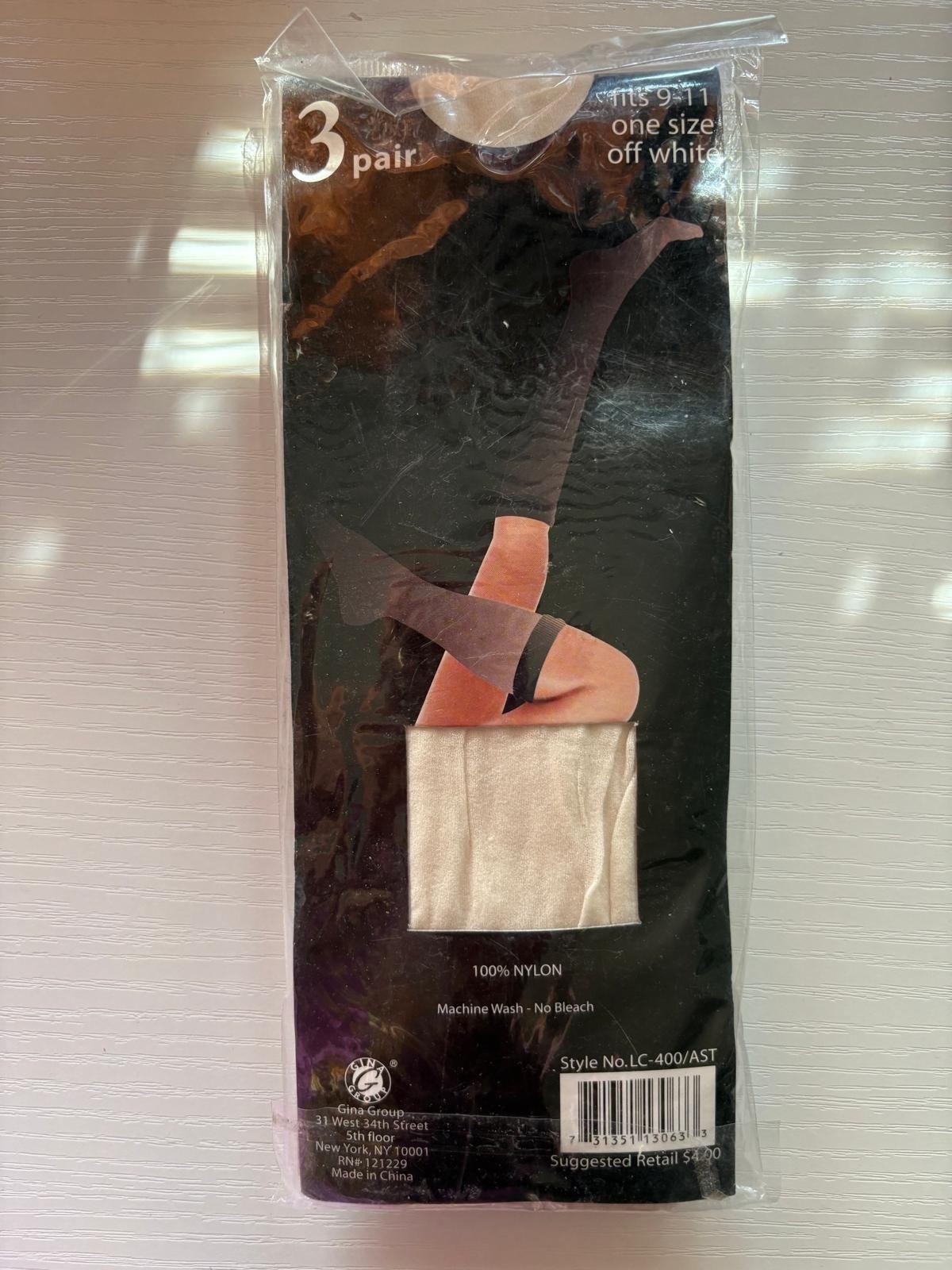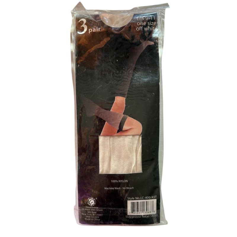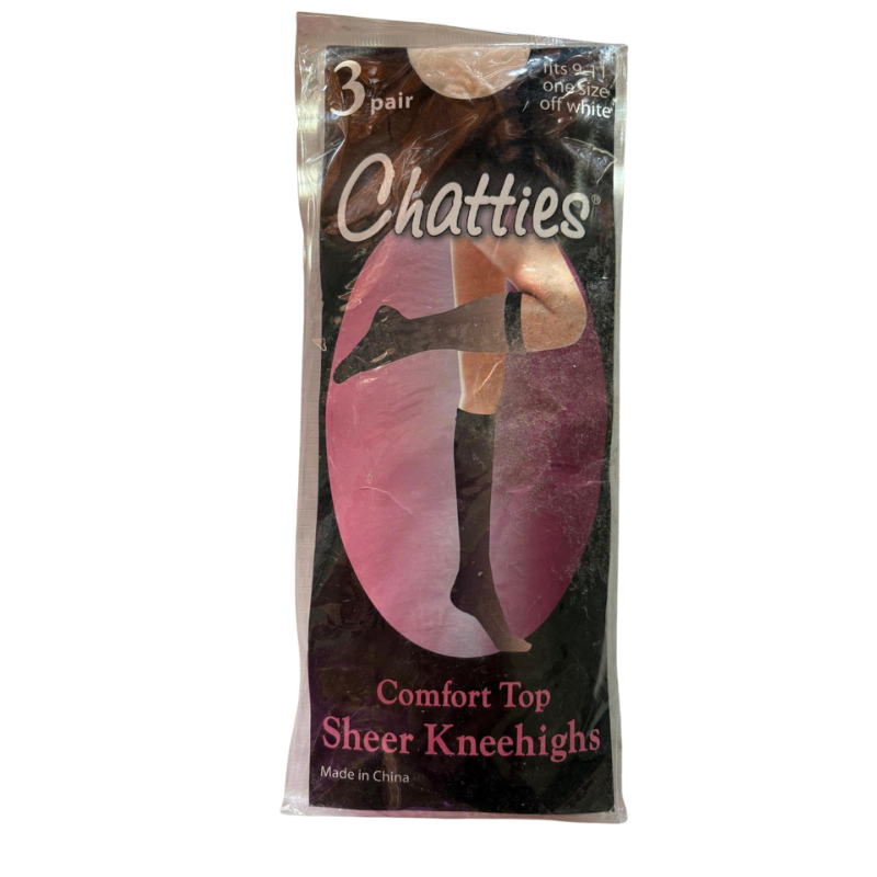 Brand new in sealed package, this set includes 3 pairs of Chatties Comfort Top Sheer Knee Highs in an off-white shade. Made of 100% nylon for a soft, sheer finish that?s perfect for everyday wear or work attire. Fits shoe sizes 9?11. Lightweight and breathable with a comfort top band that stays in place without digging in.