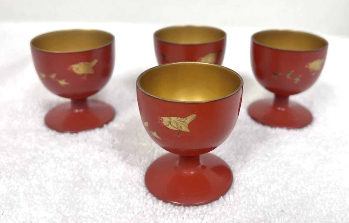 4 Vintage Asian Lacquerware Egg Cups w Chicken & Baby Chick Design GOLD Inner 2"