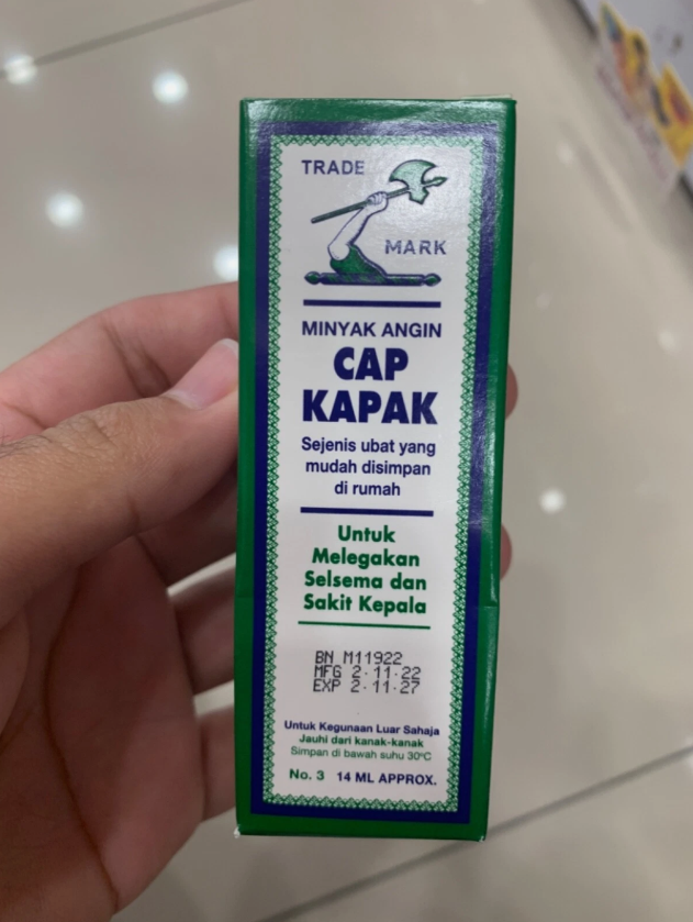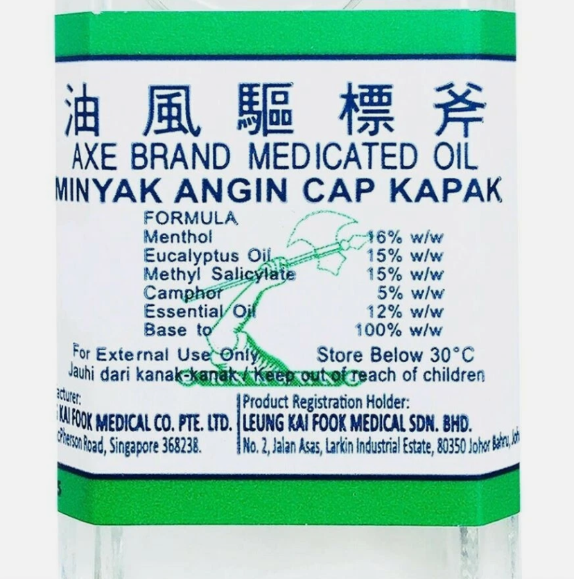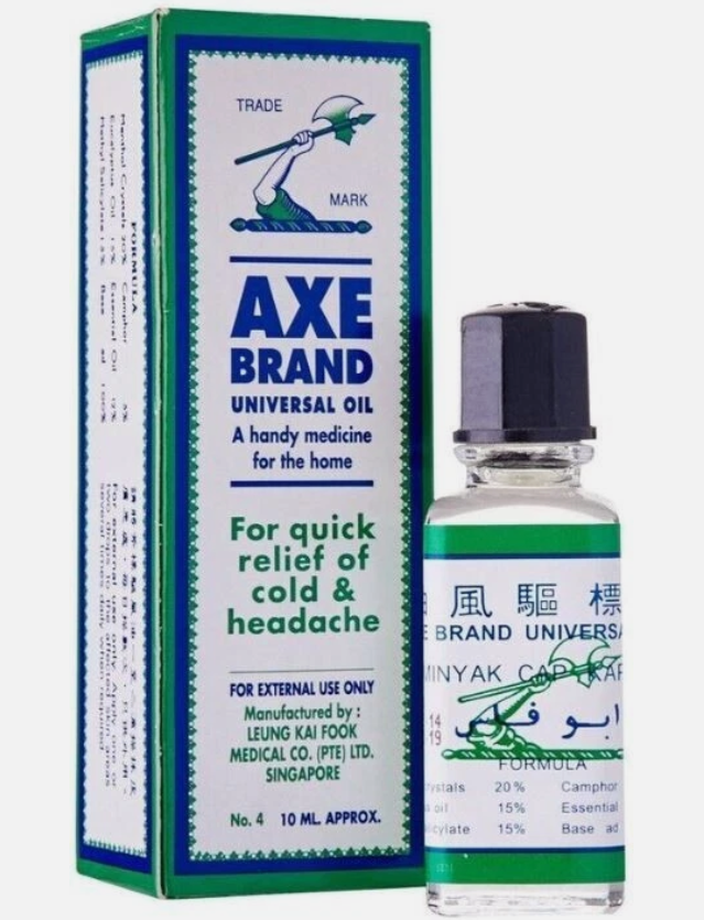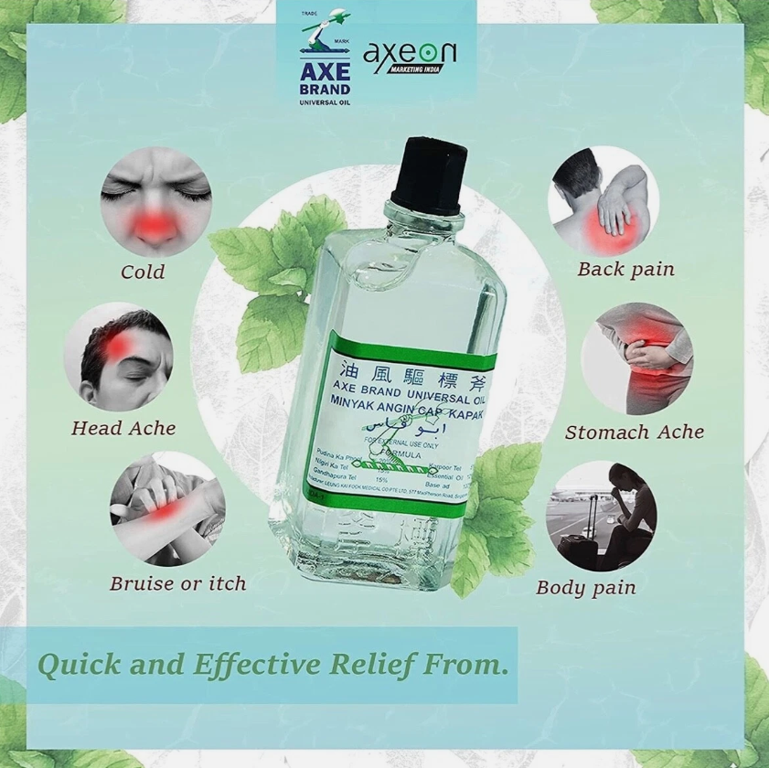 Axe Oil is made up of a special formula and has been used worldwide for more than 80 years. It is crystal clear and refreshing. It is soft and suitable for dizziness / drunken travel, headache, nasal congestion, colds, abdominal discomfort and wind, insect bites, bone and muscle aches and joints.