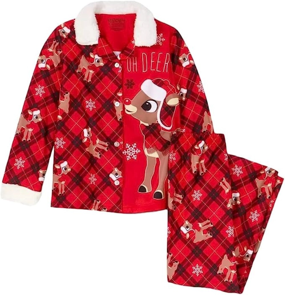 Rudolph Girl's Plaid 'Oh Deer' Button Down Flannel Christmas Pajama Set