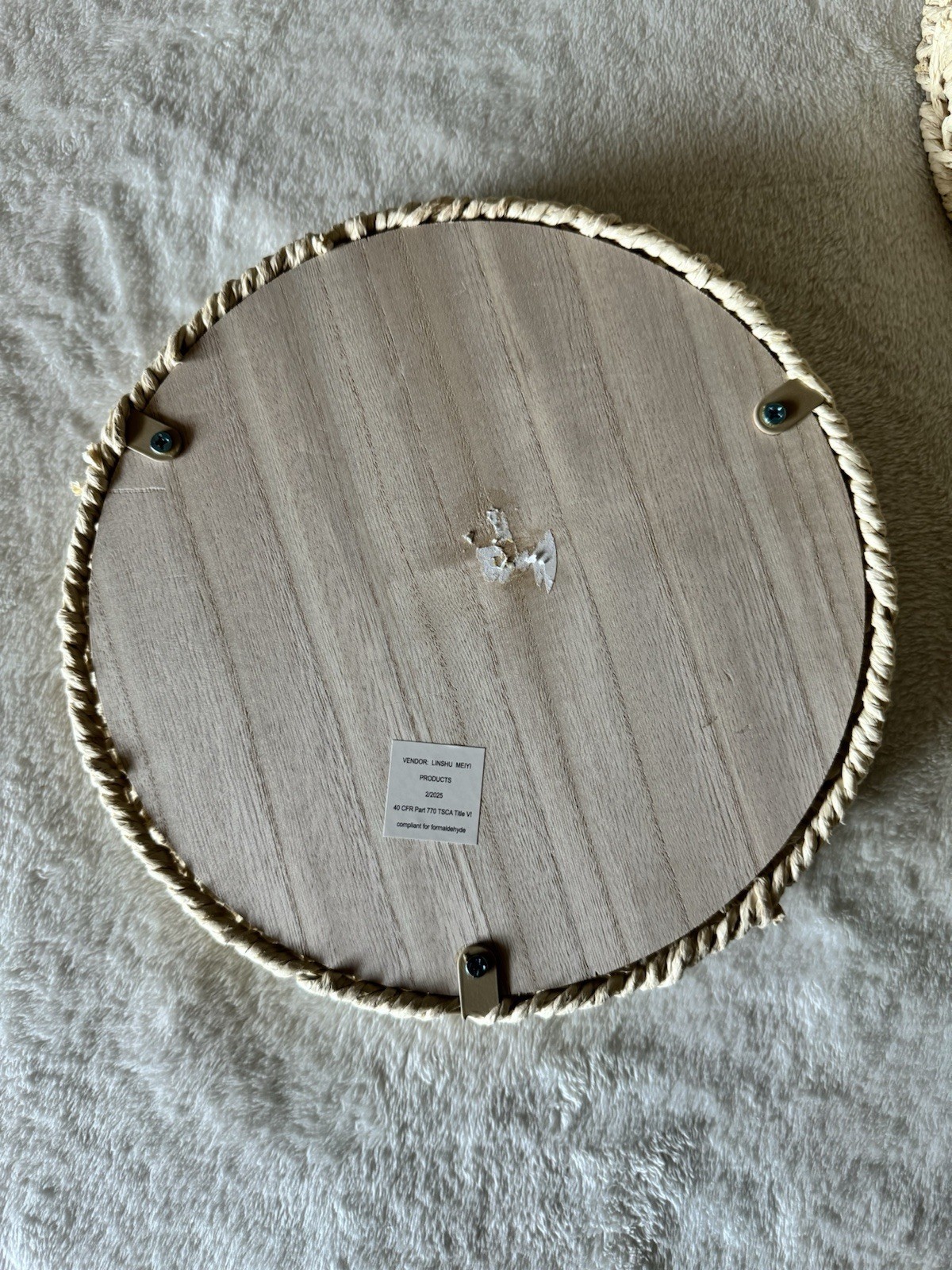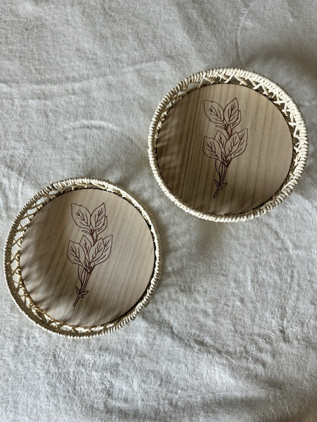 Natural Leaf Engraved Design Wooden And Woven Trays (Set Of 2)