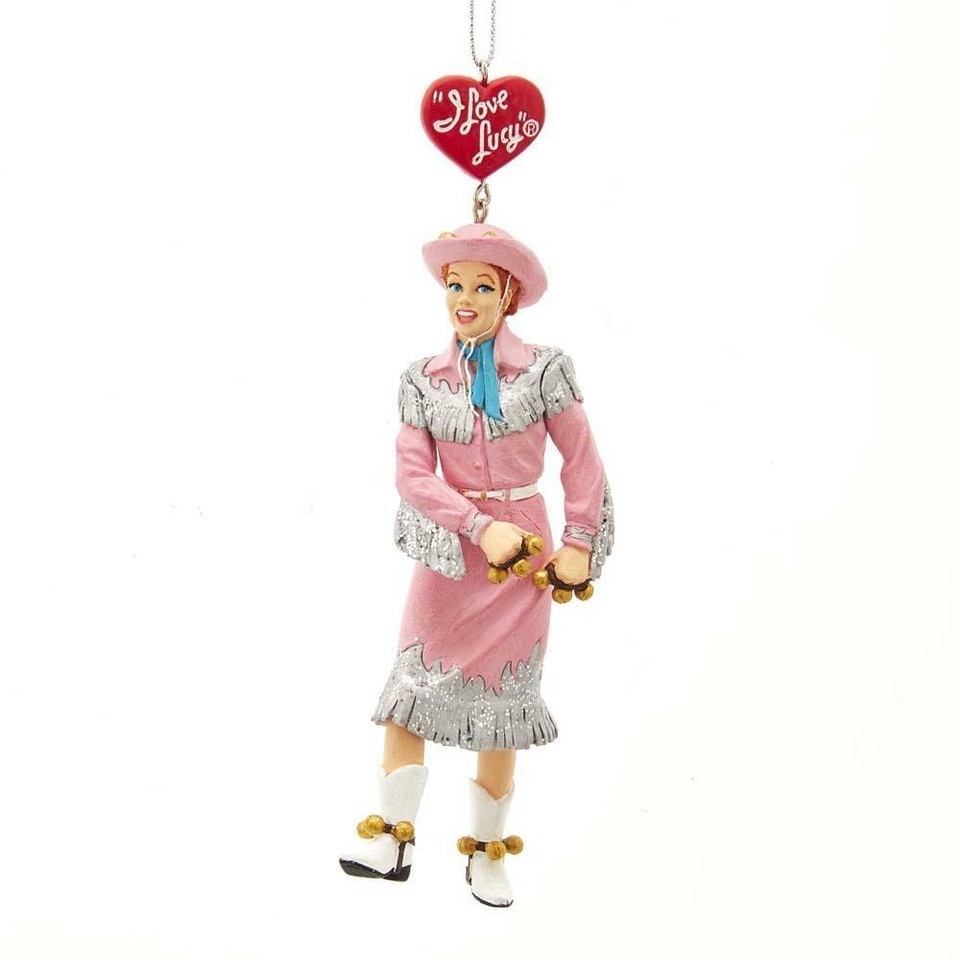 This Kurt Adler I Love Lucy cowgirl ornament is a fun, unique way to add to any I Love Lucy fan's holiday decor or collection! Featuring a giddy Lucy dressed as a cowgirl, this wonderfully detailed figural ornament hangs from the red heart logo from the beloved show.
