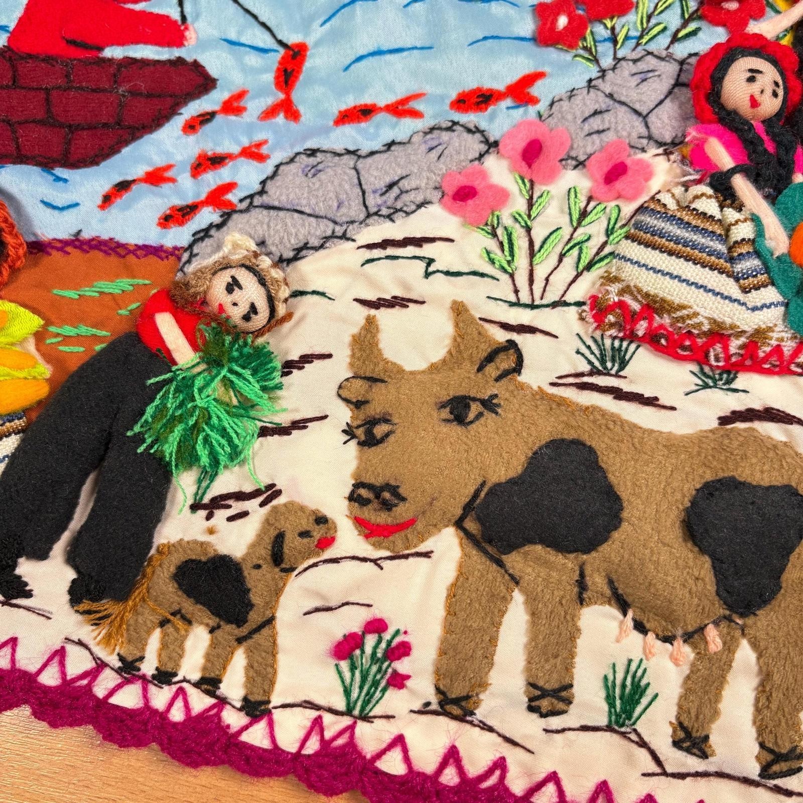 Bring vibrant Peruvian folk art into your home with this one-of-a-kind handmade arpillera wall hanging, crafted by women artisans in the Andes. This 3D textile mural features colorful hand-stitched scenes of daily life in a rural Andean village ? from farmers and animals to markets and mountains ? all made from 100% cotton fabric scraps in true arpillera tradition.
