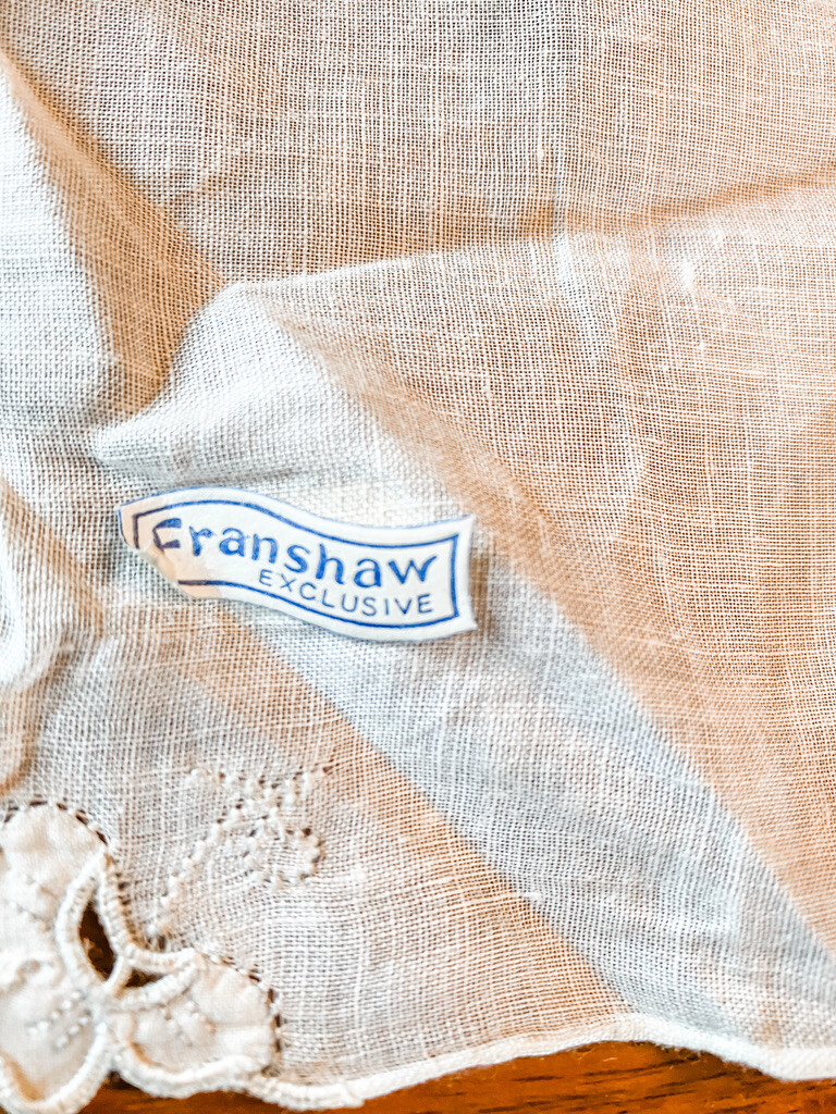FRANSHAW vintage 1950s Linen Madeira Embroidered HANKIE, with 4 corner Clovers, in Ivory , New with tags. Tags say handmade in Madeira. 10" square.