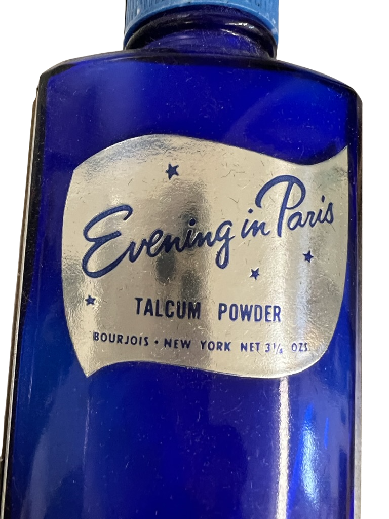A nostalgic treasure from the 1950s! This vintage Evening In Paris 2-piece gift set includes a full-size powder and a nearly empty cologne (3 1/4 oz originally). The iconic blue box shows its age with some damage, but the full 3 oz powder remains untouched. A beautiful display piece for collectors or those who adore the classic Evening In Paris scent (even just a lingering hint!). Own a piece of fragrance history!