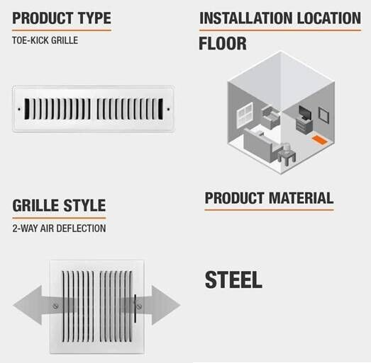 The Everbilt 326 523 2'' in. x 12'' in. Toe-Kick Floor Grille is used to cover floor vent openings. The stamped face enables 2-way air deflection. Smooth glide technology ensures rattle-free and quiet air flow from your central air system, while providing easy opening and closing of the back dampers. Made of high-quality steel, a brown powder-coated finish lends a sophisticated aesthetic.