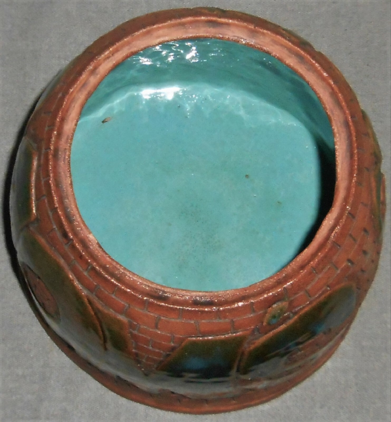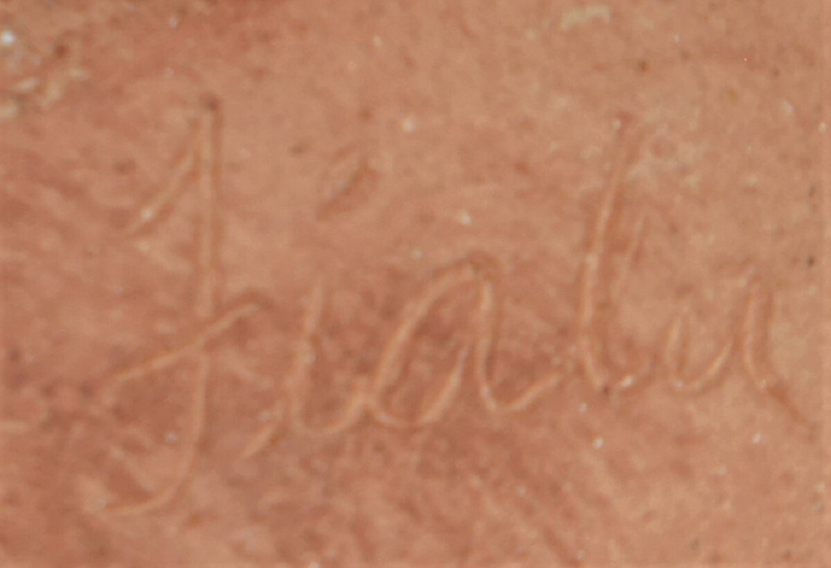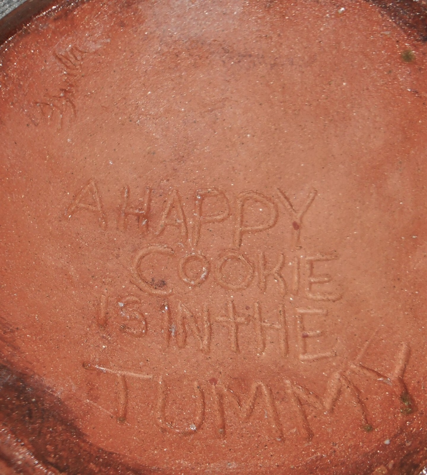 This is a unique and possibly one of a kind Art Pottery Red Clay Stoneware Cookie Jar that has a signature on the bottom "Fiala" and on the side is dated 1982. Under the lid it reads "A HAPPY COOKIE IS IN THE TUMMY - fiala". The turquoise areas are glazed over and the rest of the jar looks like it has some kind of sealer in places - not really sure but has a great effect and appearance. On the exterior is reads "MOM'S COOKIE JAR" If you like Mid Century Stoneware this jar is for you! It measures approx. 8 1/4" across at base and approx. 5 1/8" across at opening and approx. 6 1/8" tall without lid or 8 1/4" tall with lid on to top of finial. It is in good pre-owned condition - structurally sound - no chips or cracks - there is a small area on lid where the turquoise color did not cover near bottom of lid. The jar is heavy for it's size and well made.